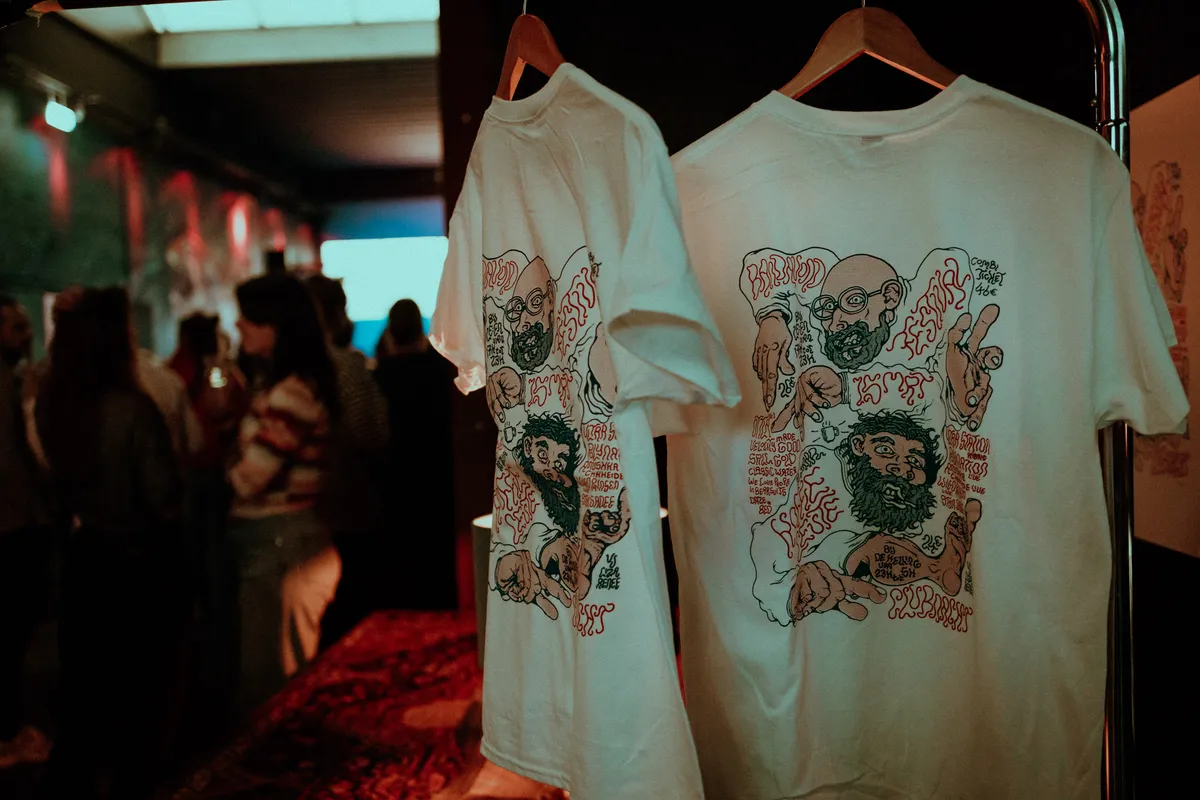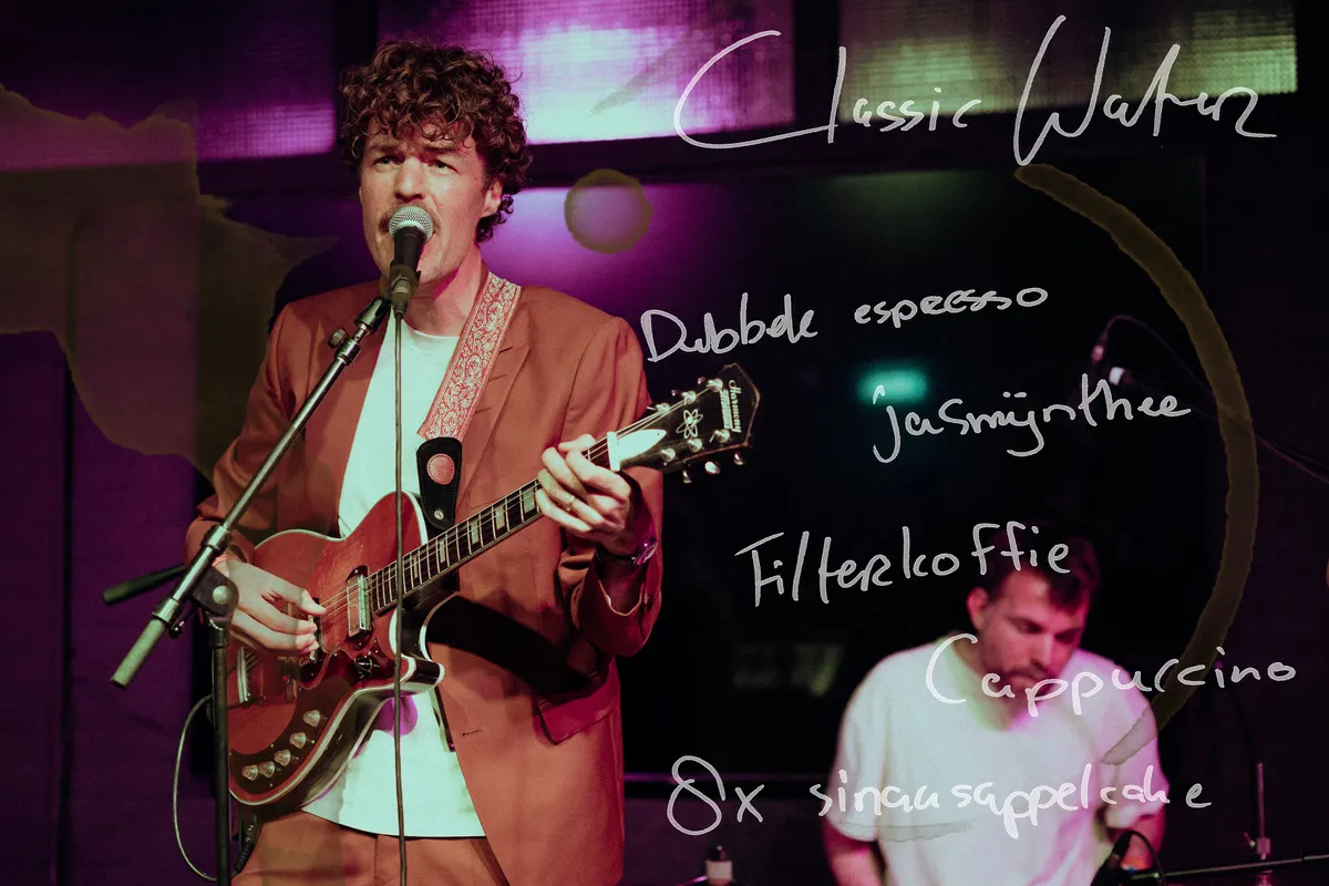 Of nee, toch niet! Het oer-Utrechtse Classic Water heeft ondertussen in de andere zaal het podium bestegen. Hun wensen zijn simpel, heerlijk en Koffie Leute staples: filterkoffie en wel twee plakken sinaasappelcake per persoon. Kijk, dat past in een vitrine. Mensen die komen luisteren naar de band, dat past echter maar nét. De loods is afgeladen vol en dat is alleen maar begrijpelijk. Het is de eerste keer dat de Utrechtse Album-van-het-jaar-winnaars weer optreden na de geboorte van de baby van zanger/gitarist Tom Gerritsen en toetsenist Lotte van Leengoed. De band speelt nieuwe muziek, tilt het publiek zachtjes aan de kraag omhoog en zwelt aan in drum- en gitaarspel op precies de juiste momenten. Ondertussen ontmoeten groepen vrienden elkaar. Tevreden nippen ze aan hun biertjes en bij het podium wiegen mensen mee in kleermakerszit. Achterin de zaal zijn de speciaal ontworpen T-shirts te koop van Koffie Leute, met daarbij een QR-code en Help Yourselves!-bord. Ook hier weet Koffie Leute de sfeer te doordrenken met lief zijn en vertrouwen.