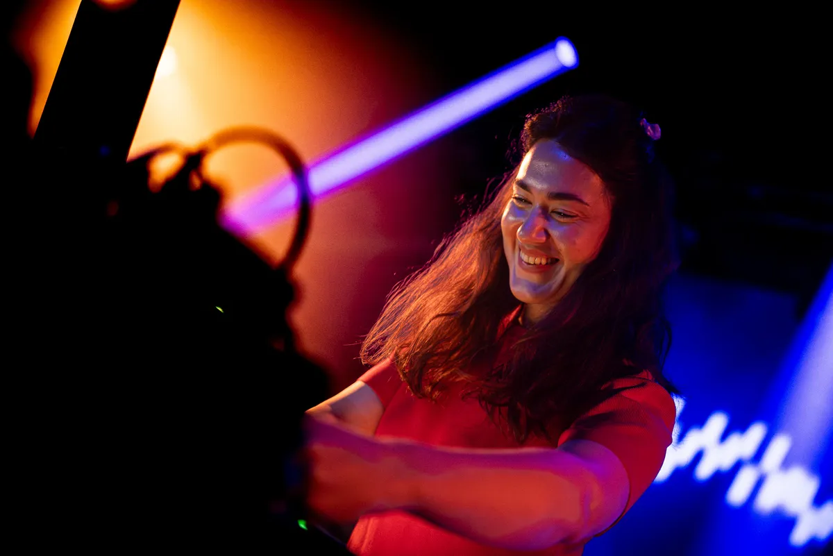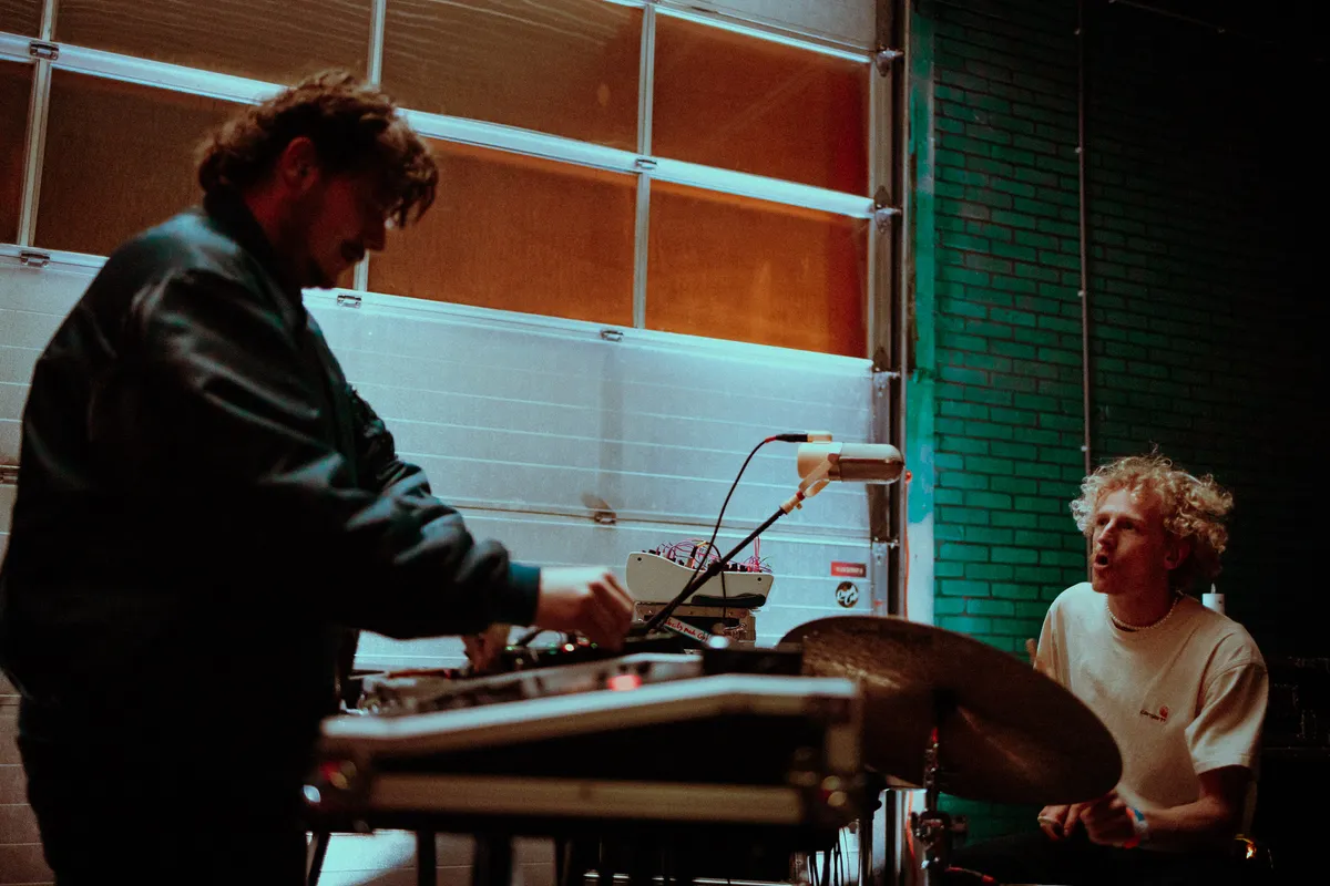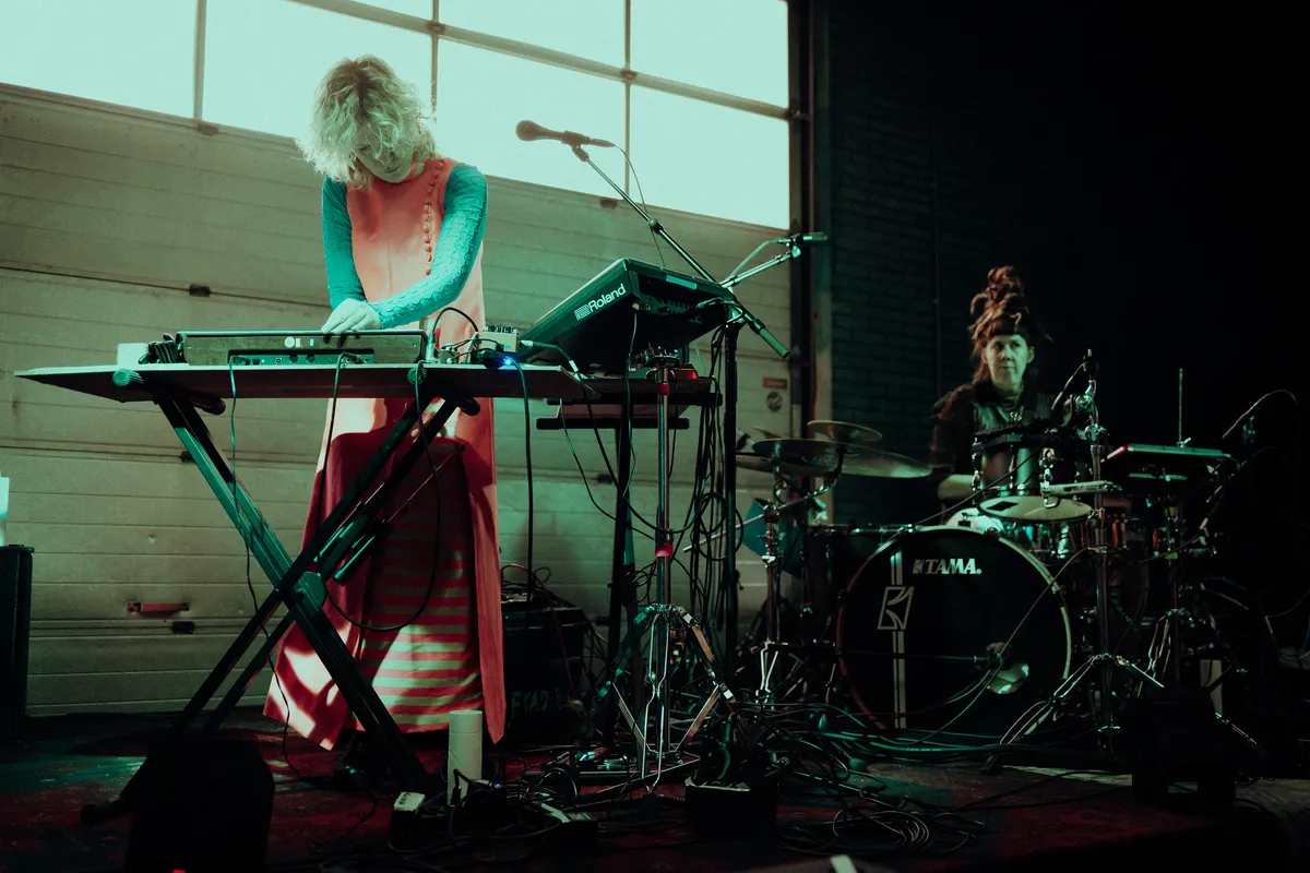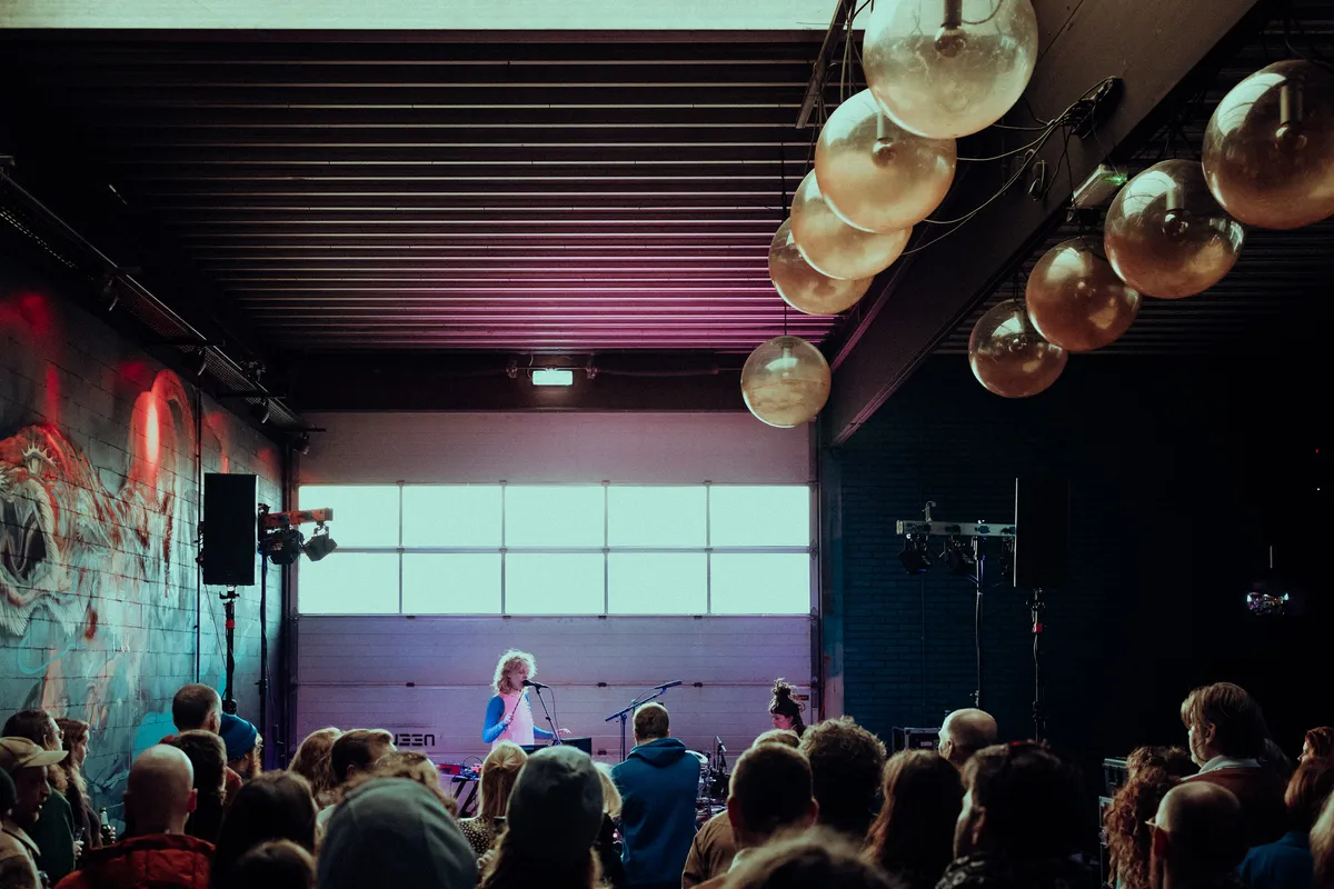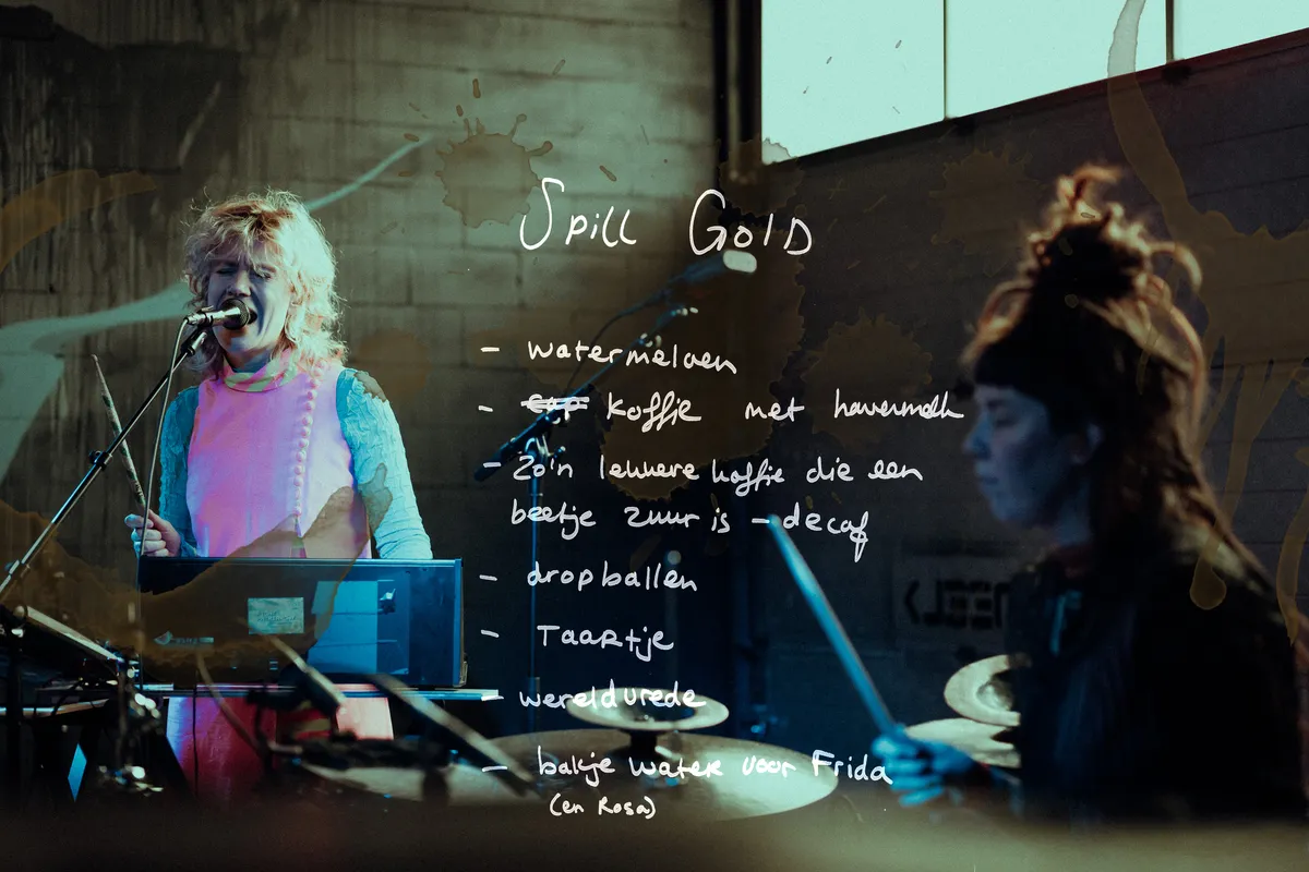 De avond vordert en steeds meer jonge en minder jonge stamgasten pakken zich samen in de loods. Veel mensen herkennen elkaar en, wanneer dat nodig is, laten ze elkaar gemoedelijk passeren. Hier is een strijd om die ene VIP-plek op de bank bij het raam niet nodig. Toch is de belangstelling voor een plekje vooraan bij Spill Gold hoog. En niet zonder reden. Dit Amsterdamse duo zingt, drumt en synthesizert erop los en hun aanstekelijke ritmes laten het publiek steeds wilder meedansen. Er komt nog nét wat zonlicht door de golfplaten in het plafond. Met dat gouden licht en de garagepoort in hun rug, krijgt de sfeer iets éxtra kosmisch. Na hun optreden vragen we het duo nog even naar hun koffiebestelling. Watermeloen, een beetje zure koffie, dropballen en wereldvrede. Misschien moet Koffie Leute na 10 jaar toch echt dat assortiment updaten.