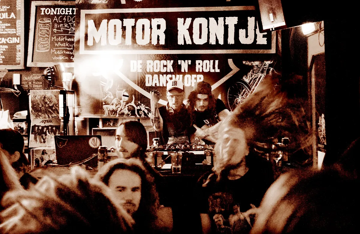 We lopen voor het interview de Zwarte Ruiter binnen, de plek waar het allemaal begon. Marco Bijsterbosch (dj IJzerman) en Ivan van ‘t Leven (dj Grand Lizard) werkten hier samen achter de bar. Met een stapeltje cd’s onder de arm mochten ze tijdens bardiensten de muziek verzorgen. “We waren mensen aan de bar aan het helpen, maar ondertussen moest je luisteren: oké, het nummer is bijna afgelopen, ik moet nu iets opzetten,” vertelt Marco. “En wat zal ik dan opzetten? We draaien alleen met cd’s, dus je moest dus letterlijk alles klaarzetten en ondertussen ook afstemmen.” De heren kregen de vrijheid van de Grote Markt om hun eigen ding te doen, zolang het publiek het maar leuk vond. Ze merkten dat er behoefte was aan een avond met alleen gitaarmuziek. “Je kan mainstream rock-'n-roll draaien van Nirvana tot Metallica, maar we wilden eigenlijk ook moeilijkere punk en metal draaien en wat meer de diepte ingaan. Toen dacht ik, daar moeten we een speciale avond voor in het leven roepen. Dat is Motorkontje uiteindelijk geworden.”