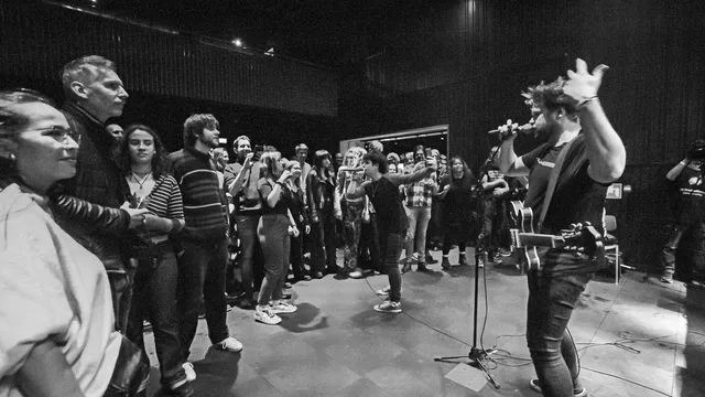 Sunday at Eight? Vroeger was dat tijd voor Studio Sport, maar sinds een paar jaar is dit een Leidse indierockband. Dit viertal speelt technischer, vrolijker en bedachtzamer dan Downtown District. Introverter ook – deze vier zijn geen publieksspelers en de aankleding hebben ze heel kaal gelaten: er staat alleen de band, voor hen geen videoprojecties, banner of tien gitaren in een standaard. Dat geeft het iets nuchters: wat je ziet is wat je krijgt. Sunday at Eight speelt ook de twee openingsnummers van hun EP ‘Ride’, maar zanger Damiaan bekent dat hij de cd’s met de EP is vergeten. Bassist Sam, die in een platenzaak werkt, plaagt hem: 'Ik heb nog nooit zo'n goede zakenman gezien!' Ook hun muziek is regelmatig dromerig: het psychedelische ‘Turn the Tide‘ zou Heath zo willen coveren, inclusief de bluesgitaarsolo. We horen bij andere nummers funkinvloeden en iets Oasisachtigs dat redacteur Ruben “een George Harrisonmomentje” noemt. De intro van King Cobra ruikt dan weer naar 'Smells Like Teen Spirit’. Ze sluiten af met hun uplifting kerstnummer 'Let It Slide.'