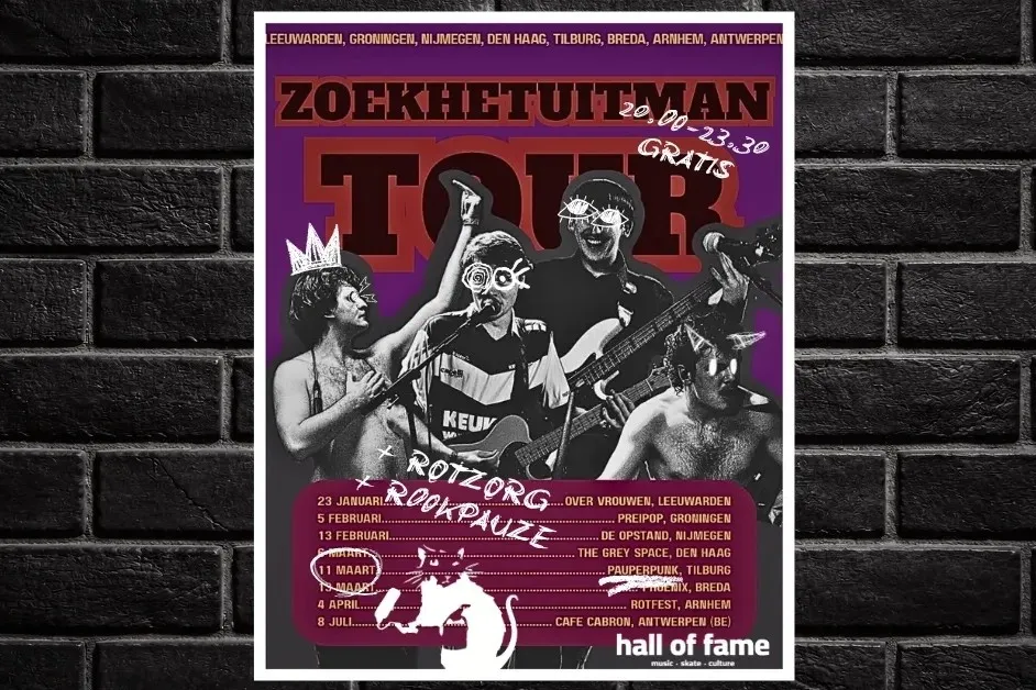 Voor een rockende start van de maand ben je bij de Hall aan het juiste adres: woensdag de vierde treden Queen's Pleasure en Crybabies al aan, een dag later gevolgd door Orange Skyline en Kameyo. Om daar bij te zijn heb je wel wat duiten nodig, maar vrees niet als je die ontbeert: op de elfde is er weer een vrij toegankelijke editie van Pauperpunk, ditmaal met Zoekhetuitman, Rookpauze en Rotzorg. Dolletjes.