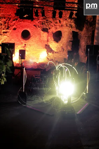 Op het podium van Extrapool werd deze avond niet alleen zoals gebruikelijk het oor getrakteerd, maar kreeg ook het oog eens wat anders. Een gevaarte met slangetjes en ijzerwerk pronkte voor de eeuwenoude hoop stenen van de Ruïne. Achter deze installatie had zich een blonde, wat afstandelijke vrouw verschanst.