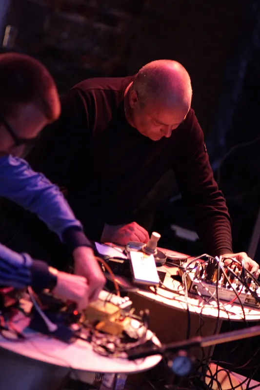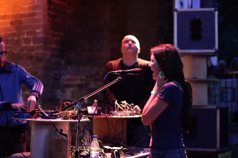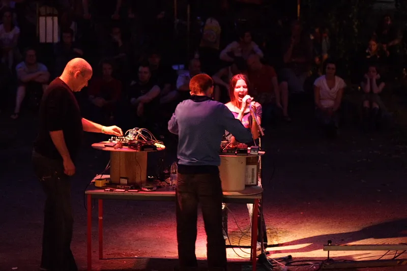 Vooraf hoorde ik al een soort waarschuwing van een andere bezoeker: "Ik denk dat het rustig begint en dat het in een rechte lijn opbouwt tot een flinke dreun." En verdomd, zo was het ook. Niet dat diegene theeblaadjes leest of anderszins voorspellende gaven heeft - een optreden van Machinefabriek heeft nu eenmaal de neiging weinig uitdagend te zijn in zijn opbouw. Tenminste: de optredens die ik tot nu toe heb gezien. De setting is leuk. Twee knoppenbedieners en één zangeres om de samples live in te zingen. En dat doen ze goed. Rutger Zuydervelt en Robert Deeters weten waar ze mee bezig zijn. Ze samplen de stem van Mariska Baars, bewerken een microfoon met een scheerkwast, draaien aan hun knoppen.