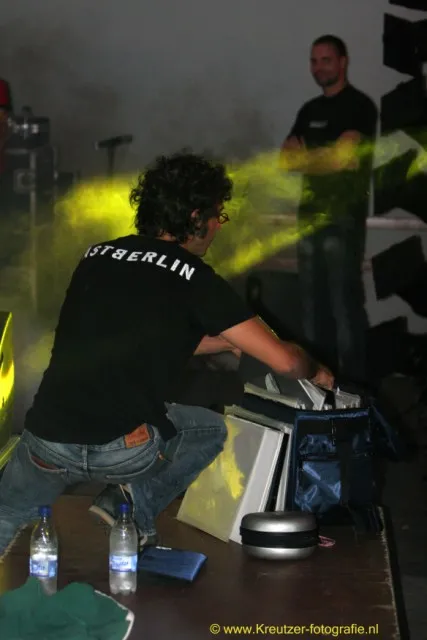 De volgende act, de Nijmegenaar met de exotische naam Giorgos Gatzigristos, dreef de sfeer naar een hoger niveau met uit zijn laptop tevoorschijn getoverde dwingende minimal techno. Het was eigen werk dat duidelijk maakte waarom hij recent binnengehaald is op het Duitse Kompakt label, want de tracks stonden als een huis. Het was alleen een beetje jammer dat hij af en toe al te graag leek te willen bewijzen dat zijn performance uit meer bestond dan het slechts aanklikken van de ‘play’ knop van Winamp, want zijn gedraai aan de effectenknoppen begon op een gegeven moment danig op de zenuwen te werken.