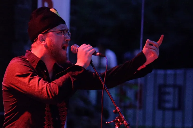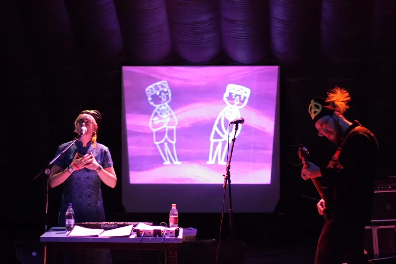 Tussen de overblijfselen van de Barbarossakapel stond gisteren, zoals altijd eigenlijk, weer een bijzondere act. The Kleber Claux Memorial Singers maakt anarchopunkpop met Casio, gitaar en vreemde filmpjes. Het duo wist daarmee goed de aandacht te trekken.