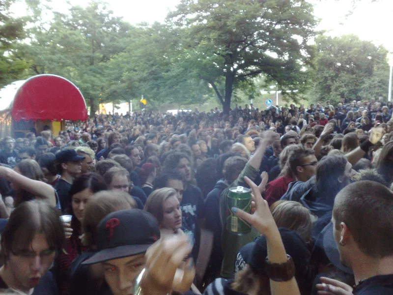 Bij Heidevolk staat het veldje helemaal vol. Hier wordt de lijn gewoon doorgetrokken en vanaf de eerste noten is het ook een kolkende massa voor het podium. Heidevolk geniet ervan en zweept het pubiek nog meer op. In een uur komen er nummers van beide albums voorbij, waaronder natuurlijk het verplichte ‘Het bier zal weer vloeien’ en ‘Gelders Volkslied’, die luidkeels ondersteund worden door het Nijmeegse legioen. Bij Finntroll is de ruimte echt te klein en puilt het uit. Maar dat mag de pret niet drukken. De mensen lijken een onuitputbare energiebron te hebben, want het wordt geen moment minder. De zanger, het nieuwste lid van de trollenfamilie, doet niet onder voor zijn voorganger.
