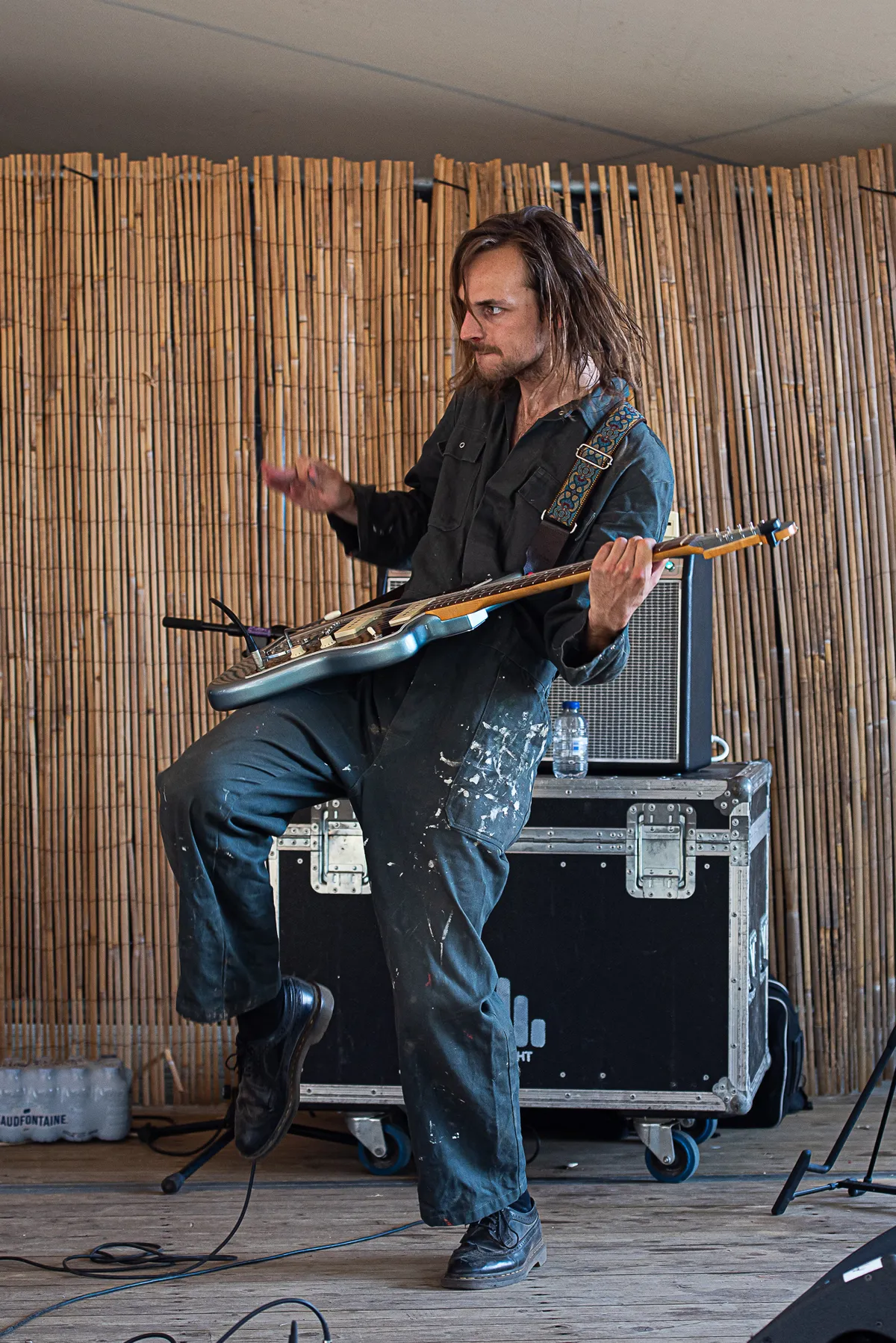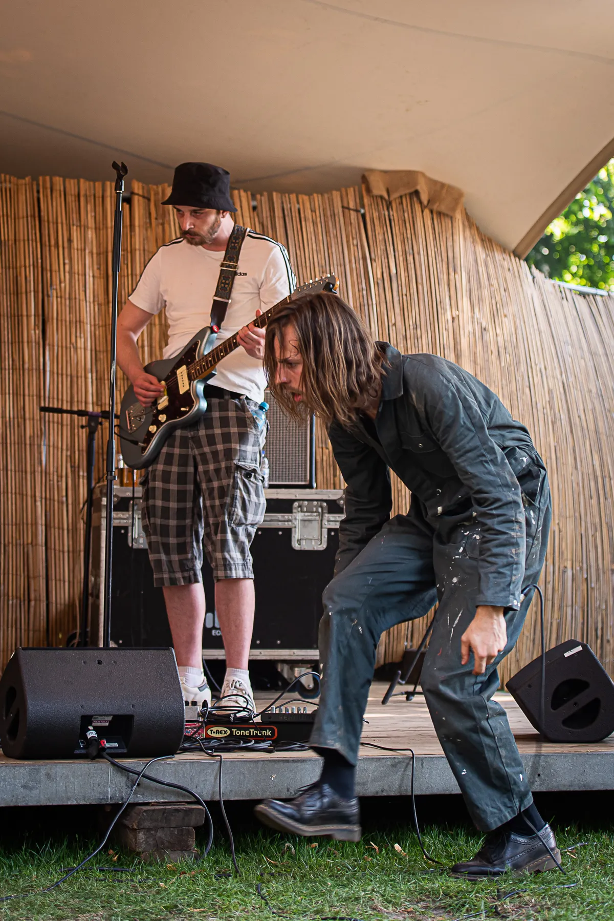 De twee bandleden, gehuld in zware overalls, beginnen de set nog rustig om de energie een beetje te verdelen gezien de hitte. Iets voorbij de helft van de set, bij het stemmen van de gitaar, vraagt Stefan: “wie een beetje gitaar kan spelen mag zich zo melden.” En prompt stapt Tjeu Raaijmakers, gitarist van oa TNSD, op het podium en speelt ‘In Full Effect’. Stefan gaat met de microfoon over het terrein en het podium, zingt loopt, rent, bewerkt het geluid tot noise effecten en beweegt haast bezeten zoals hij dat ook bij TNSD deed. Dit is zijn muziek, zijn energie waarmee hij zijn emoties uit.