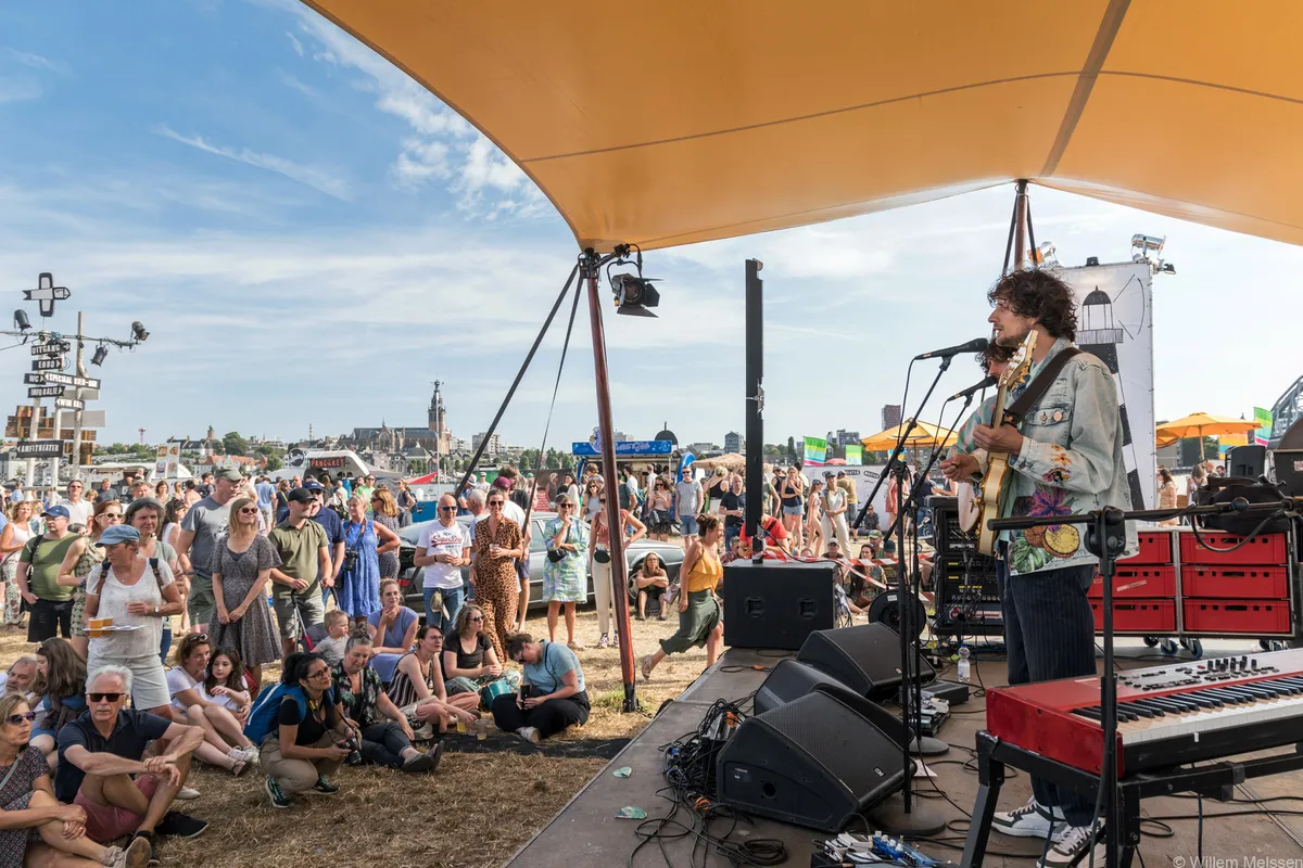 Een beetje flauw om te zeggen misschien en we zijn ook vast niet de eersten, maar hun close-harmony stemmen passen bijzonder goed bij elkaar. Net als hun gezichten trouwens, en hun haar. Je kunt er niet omheen: Arnout en Sander Brinks vormen een identieke tweeling. Maar er is een duidelijk verschil. Volgens Arnout althans, die er voortdurend op hamert hoe fantastisch Sander er uitziet, ‘met zijn prachtige haardos en zijn fraaie, eh, enorme neus. En die welluidende stem!’ Jammer genoeg valt zijn humor een beetje plat in het zand. Het kan de warmte zijn, of het tijdstip van de dag maar het veelal zittende publiek reageert uiterst lauw op de interactie die Tangarine op gang probeert te brengen.