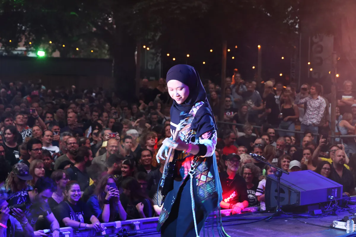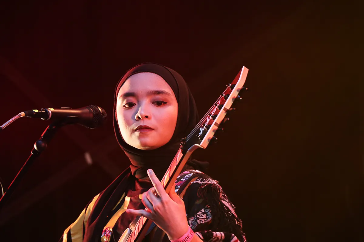 Met recht worden ze aangekondigd als een van de verrassingen van dit Valkhoffestival. Een bijzonder en vooral dapper trio jonge Indonesische feministische hardrockers uit West Java. Want alles wat volgens hun culturele traditie niet mag brengt Voice of Baceprot (spreek uit: bah-SIE-prot, betekenis ‘herrie’) voor het voetlicht. Ze ogen bescheiden met hun strakke hijab en traditionele kleding maar ze maken een duidelijk statement. Hier geen onderdanige vrouwen maar een stel stevig rockende meiden die weten wat ze willen en dat ook niet onder stoelen of banken steken.
