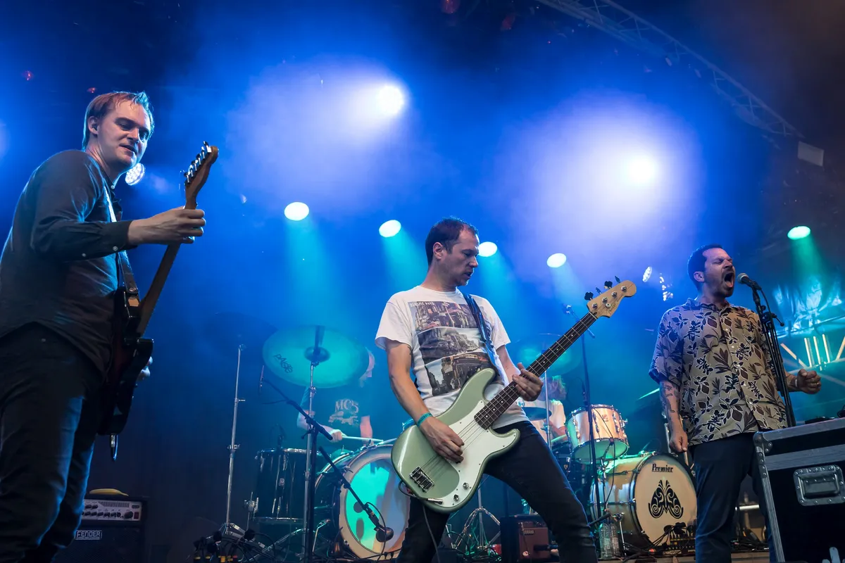 Je hebt artiesten die even "goedenavond Valkhof Festival" zeggen voor ze beginnen, en je hebt de Fransen van Birds in Row die direct "confusing loneliness for freedom, solitude for a serum, and complaints for poetry" op het publiek afvuren. Heb je een weekje niet gedoomscrolld op Twitter? Zanger 'B.' praat ons vanachter zijn ogen-versluierende haardos even bij: de wereld staat in brand, de situatie in Frankrijk is 'fucked up' en we zijn eenzamer dan ooit. Het zorgde na twee platen bijna voor het einde van de band, maar juist het schrijven over depressies, geestelijke gezondheid en de link daarvan met politiek zorgde in 2022 voor magnum opus Gris Klein - en vanavond voor een indrukwekkende Valkhof-show.