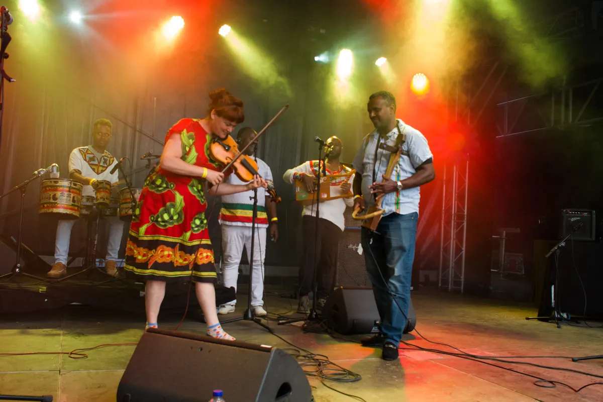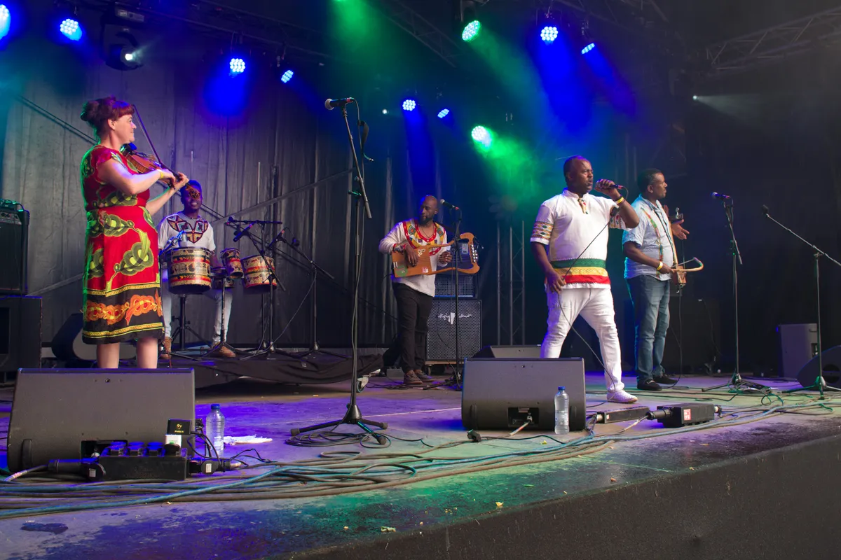 Qwanqwa bestaat ondermeer uit Kaethe Hostetter op elektrische viool en Endres Hassen Ahmed op een zelfgebouwde masenqo, een eensnarig strijkinstrument dat vooral gehanteerd wordt bij traditionele muziek uit Ethiopië en Eritrea. De band nam deel aan projecten met de Nederlandse experimentele band The Ex, en het experimentele is vanavond ook zeker te horen. 'Mela Mela' bijvoorbeeld mengt vrije jazz met funk, roots en psychedelica. Tegen half negen stroomt het veld voor het podium vol en wagen de vele bezoekers zich aan een dansje, voortbewogen door de energieke set van de band. Of het dansen heeft geholpen is niet bekend, maar feit is wel dat het rond die tijd stopt met regenen. Qwanqwa betekent taal in het Amhaars: vanavond is het de universele taal van muziek die band én publiek samenbrengt. (PSB)