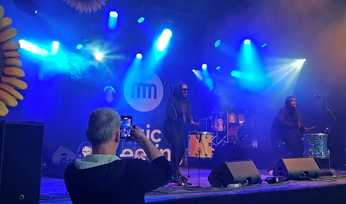 Het podium is nog nat van de regen, waardoor het drietal dichter bij elkaar staat en er een leuke interactie ontstaat. Achterin het publiek wordt de muziek ervaren als achtergrondmuziek, terwijl men vooraan danst en na elk nummer applaudisseert. Het zou mooi zijn als op de backdrop de visuals gepresenteerd worden die bij de nummers horen, om zo ook het publiek achteraan bij de muziek te houden. (EM)