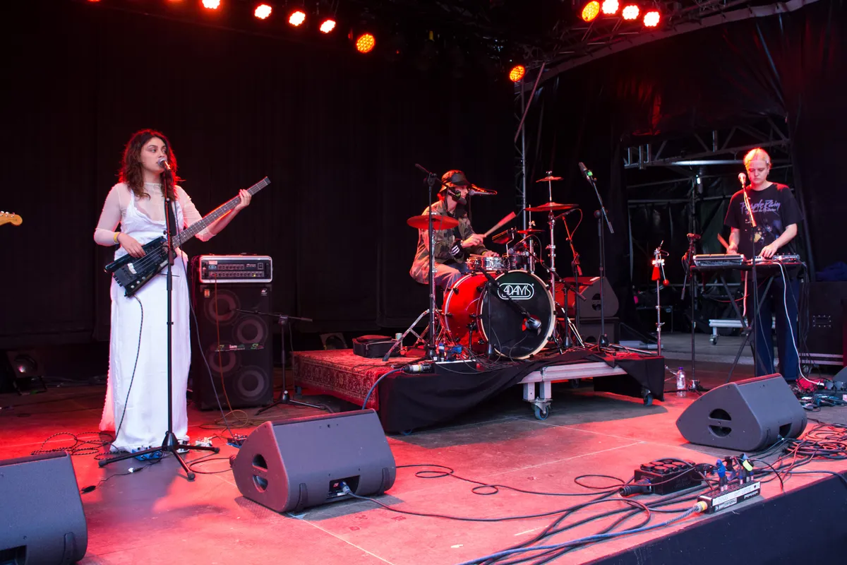 Het is zeven uur, etenstijd op het Valkhof Festival, en nog maar weinig mensen staan op de vlonders voor de Boog. Ondanks een oproep van Simon Mamahit om dichterbij te komen, blijven de eters zitten en lopen de passanten door. De Amsterdamse band Devon Rexi, bestaande uit drummer Nic Mauskovic van The Mauskovic Dance Band en Nushin Naini op bas en vocals, betreedt het podium. Ze worden vanavond bijgestaan door een gitarist en een elektronische percussionist, die met een pedalboard voor soundscapes zorgt, terwijl hij ook op de melodica blaast.