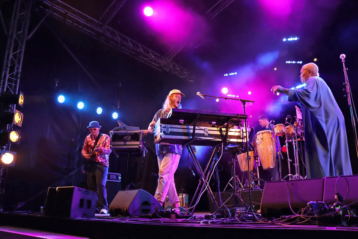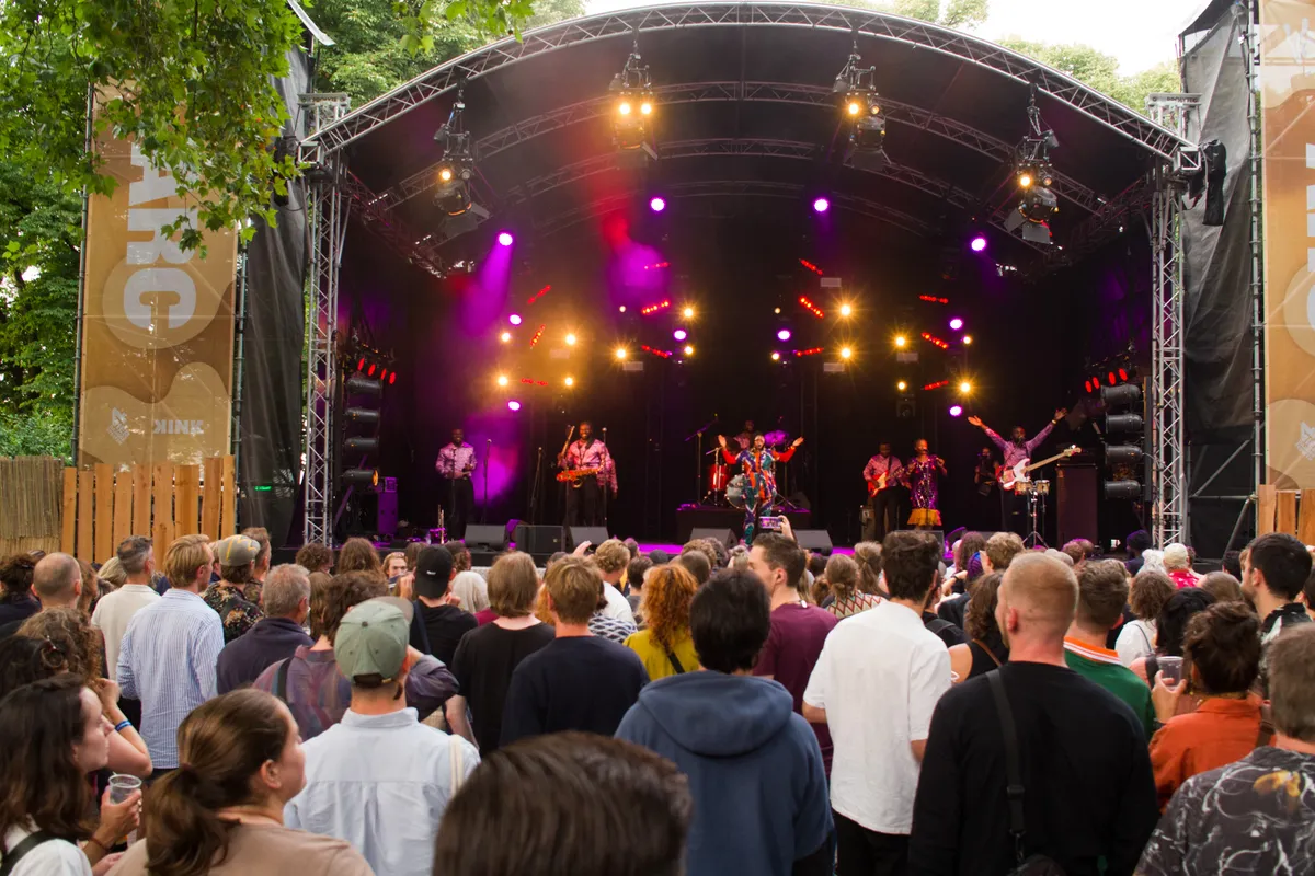 In het begin lijkt ze timide. Aftastend hoe dit publiek is. Maar al snel staat ze daar: Florence. Een pittige Ghanese tante met een 8-koppige band achter haar. Zelf is ze gehuld in een pak met felle Afrikaanse kleuren, de band heeft dezelfde paarse bloezen aan. Op de achtergrondzangeres na: zij is gehuld in glitter. Ze beloven een stukje van Ghana naar het Valkhof te brengen. En zowaar, met de eerste tonen word je naar hun thuisstad Kumasi geslingerd. Ze spelen een mix van Frafra en Highlife muziek. Ze mixen Afrikaanse traditionele klanken met jazz, hier en daar wat disco en gitaren. Op deze muziek kun je niet stil blijven staan. Dus het publiek begint al snel met hun heupen te wiegen op het nummer dat de moeder van Florence heeft geschreven: ‘Wel meezingen, anders wordt ze boos!’ Het publiek lacht. Het ijs is gebroken.