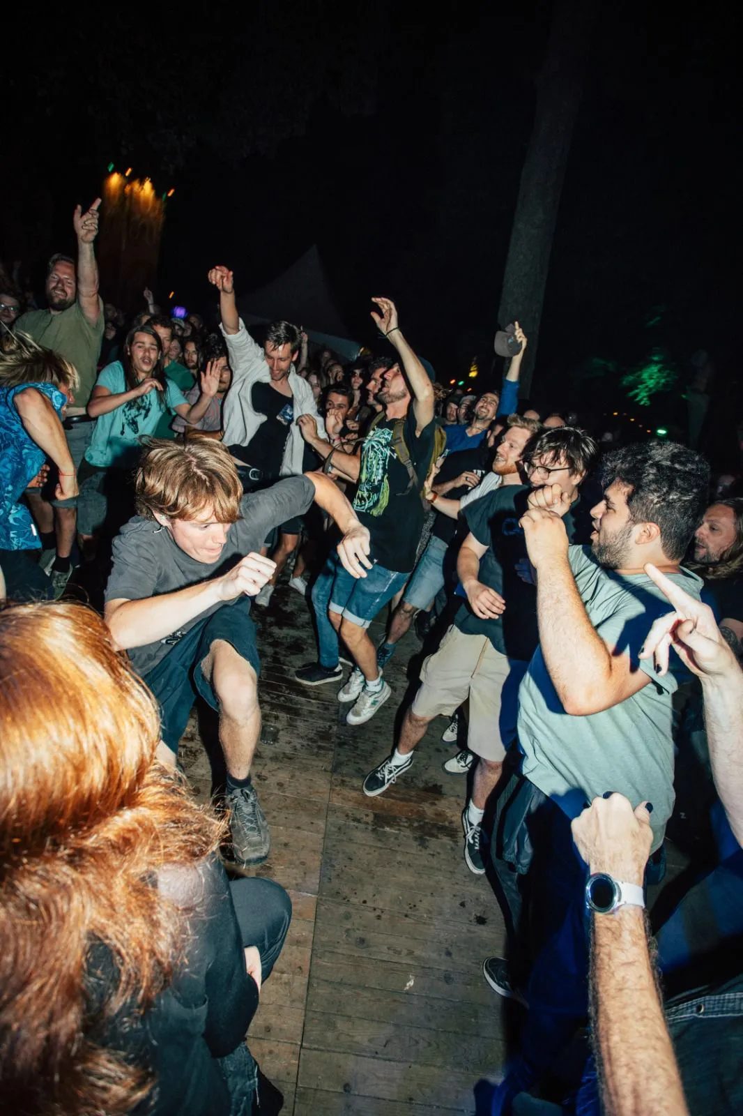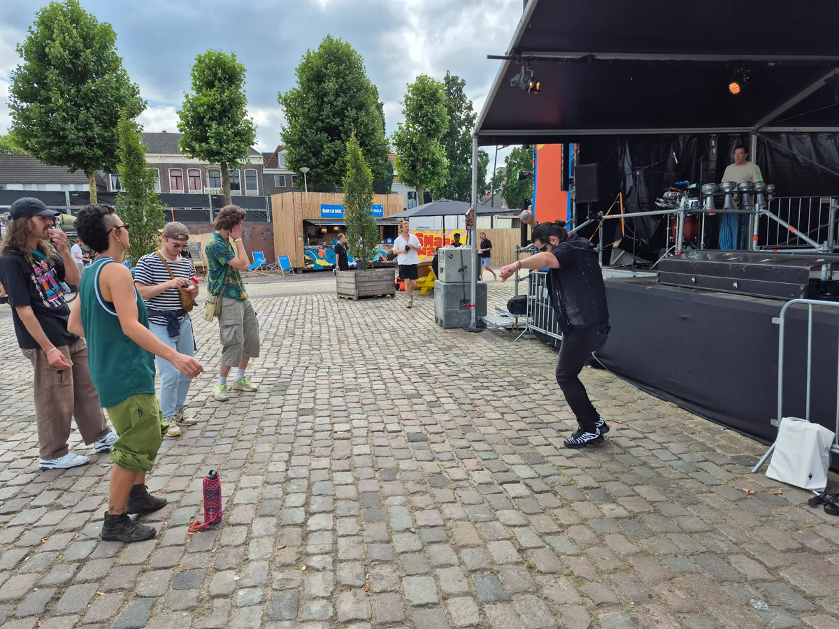 Niet veel later komen er mensen vanuit backstage die in een lange sliert alle hoeken van het plein even aan doen. Hier en daar krijgen ze mensen mee. Al zwaaiend met een Palestinasjaal houden ze de moed erin. Op de socials had de band al een statement neergezet: ze spelen weer, al was het even moeilijk. Alles wat er in Palestina gebeurde afgelopen jaar kwam dichtbij voor de bandleden die voor een groot deel uit Syrië komt. De dansende mensen, de doorstampende beat die steeds sneller gaat, de dromerige Arabische keyboard-klanken: dit feestje voelt als een daad van verzet. Ondanks alles dat er gebeurt is, gaan ze door. Steeds meer mensen komen meedoen en dansen. De stad is wakker, de lopers bijna allemaal binnen. En Shamzon bouwde gewoon zijn eigen feestje, om 14.00 uur ’s middags. (MR)