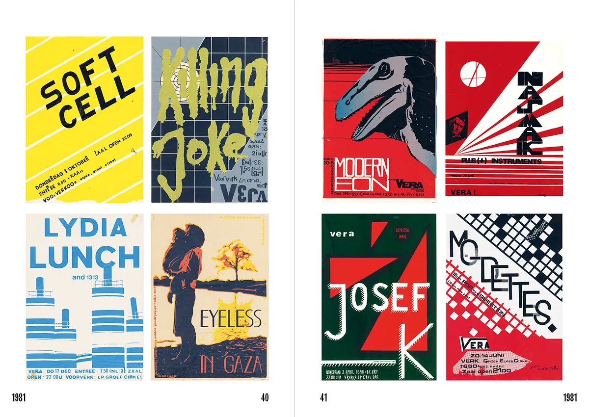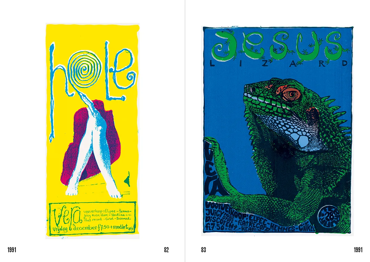 Zondagmiddag 14 september, Vera Groningen. Buiten is er ook al veel aan de hand. Op de Grote Markt wordt er een rode lijn getrokken, een protest - veelal in rode kledij - tegen de genocide in Gaza. Binnen in het pand aan de Oosterstraat wordt het langzaam voller. Geen stormloop, maar een mooie stroom mensen, verschillende generaties, jong en oud, met tote bags en herinneringen. Op het programma staat de presentatie van 50 jaar VERA Posters 1974-2024, een behoorlijk imposant boekwerk om te zien, maar vooral een kleurrijke ode aan 50 jaar DIY-mentaliteit, underground popcultuur en grafisch vernuft.