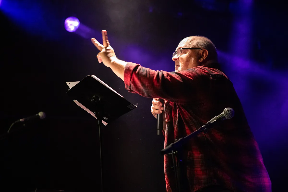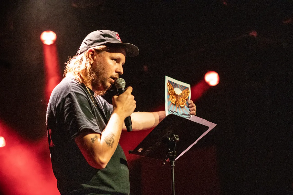 Auteur Bill Mensema opent het programma met een voordracht. We zijn de boekpresentatie begonnen… we zijn on the road. Hij vertelt over zijn eerste keer op dit podium, jaren geleden, als voorprogramma van Allen Ginsberg. Zijn verhaal is bijtend, hijgend en hartstochtelijk. Over het willen schudden van Ginsbergs’ hand - en daarmee via via ook die van Jack Kerouac. Het verhaal gaat over vergankelijkheid maar ook over de nu nog levende dromen van toen. “Iedereen zijn eigen afstand, iedereen zijn eigen droom.” Bill houdt de zaal in zijn greep. Al bladert er ondertussen wel iemand alvast door het boek. Begrijpelijk.