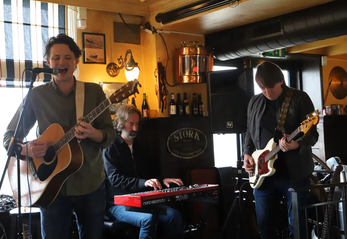 Mooie warme, vooral akoestische klanken vanmiddag: covers en ook eigen werk. En natuurlijk is ‘All the Bright Places’ de mooist denkbare opening: hét nummer waarmee AAD zich op de kaart zette en dat tegelijkertijd weemoedig herinnert aan de ‘empty places’ in zijn leven en dat van zijn bandleden. Na wat solonummers, met lekkere gitaarexplosies, maar ook klein, tokkelend en traditionalachtig, is het tijd voor een intermezzo met Richard Krijger op toetsen. “Wij zaten vroeger samen in een band (Jimmy Dumbbell) en hij viel toen uit de bandbus. Daarom ziet hij er zo uit.” In ‘Hey little girl’ en de McCartneysong ‘Heart of the country’ begeleidt Richard op toetsen. Jamie schuift nu aan en het miniatuurpodium is overladen met kabels, mengpanelen op een stoel en gitaarpedalen. Er wordt heerlijk geïmproviseerd en de ramen beslaan ervan. Daarna komt de accordeon van Richards opa zaliger tevoorschijn en dat geeft gelijk het gevoel van een traditional. Vervolgens ‘Dear Prudence,’ een Beatlescover door Adriaan.