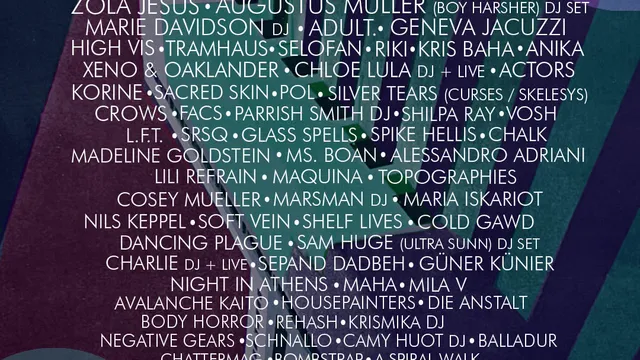 Zaterdag: X Mal Deutschland - Chalk - Xeno Oaklander - Geneva Jacuzzi - Charlie DJ set - Marie Davidson - DJ Set - Parrish Smith DJ Set -Riki - Shilpa Ray - Korine - SRSQ - Die Anstalt - Rehash - Bombsstrap - Guner Kunier - Cosey Mueller - Silver Tears - Sam Huge Ultra Sunn - DJ Set - Alessandro Adriani (live set) - Krismika DJ set - Maha - Maria Iskariot - Body Horror - MS Boan - Mila V - Balladur