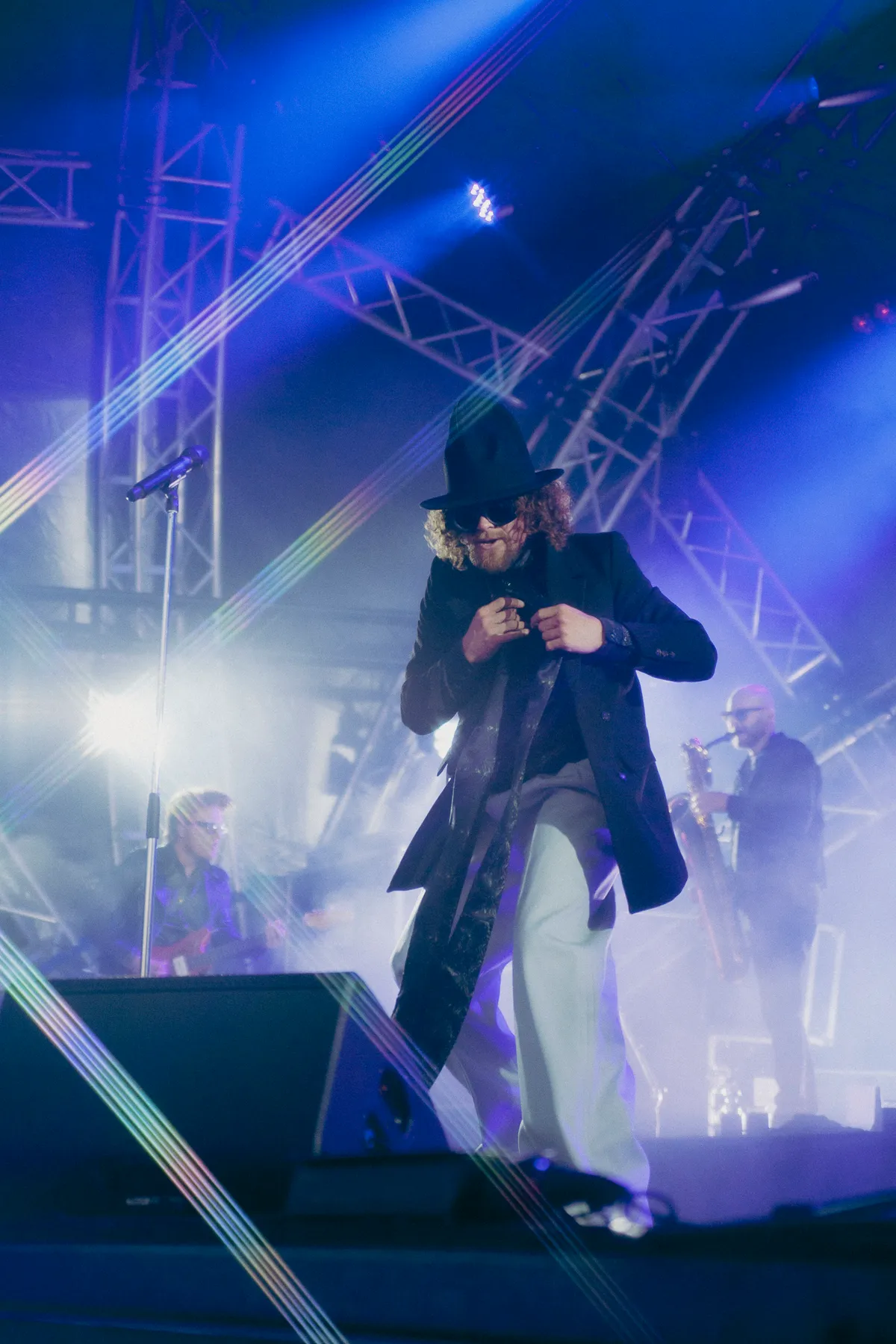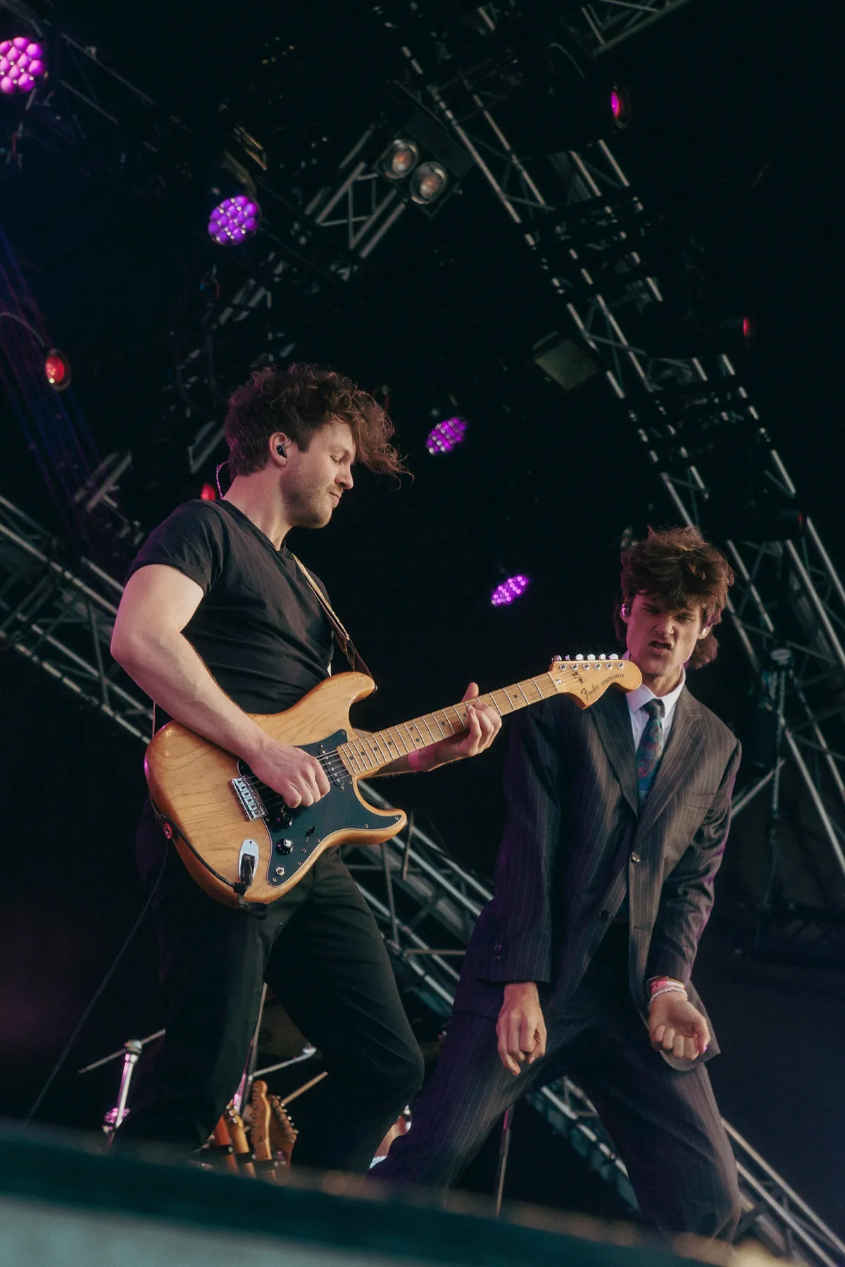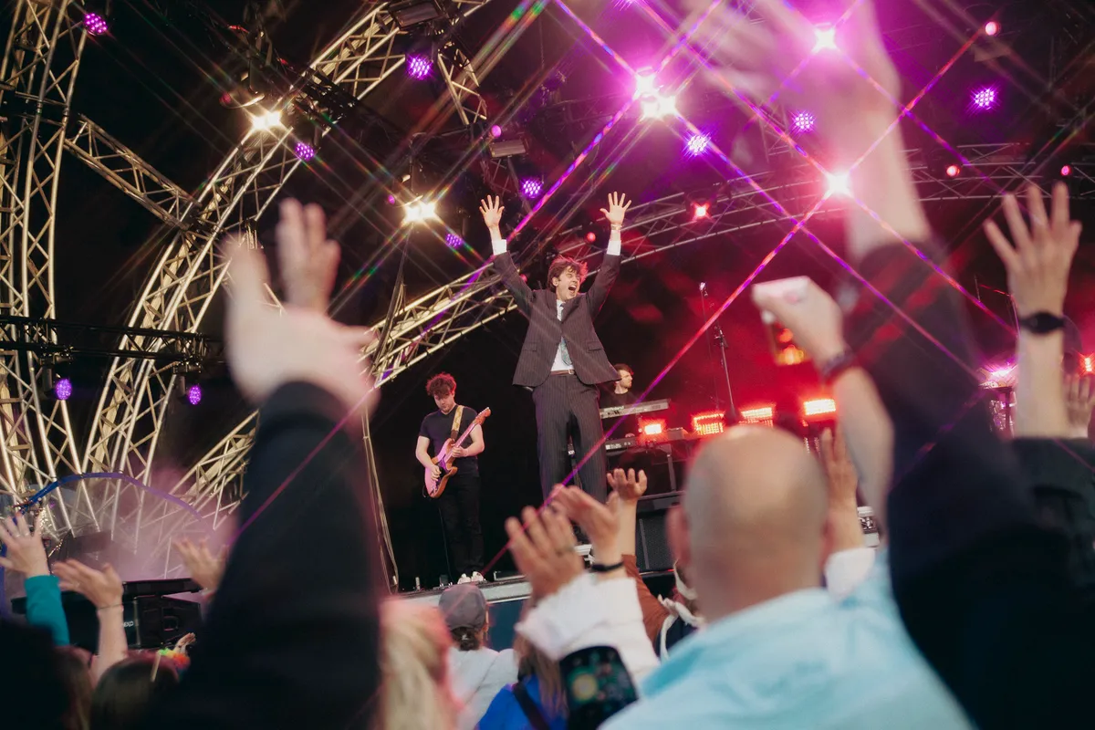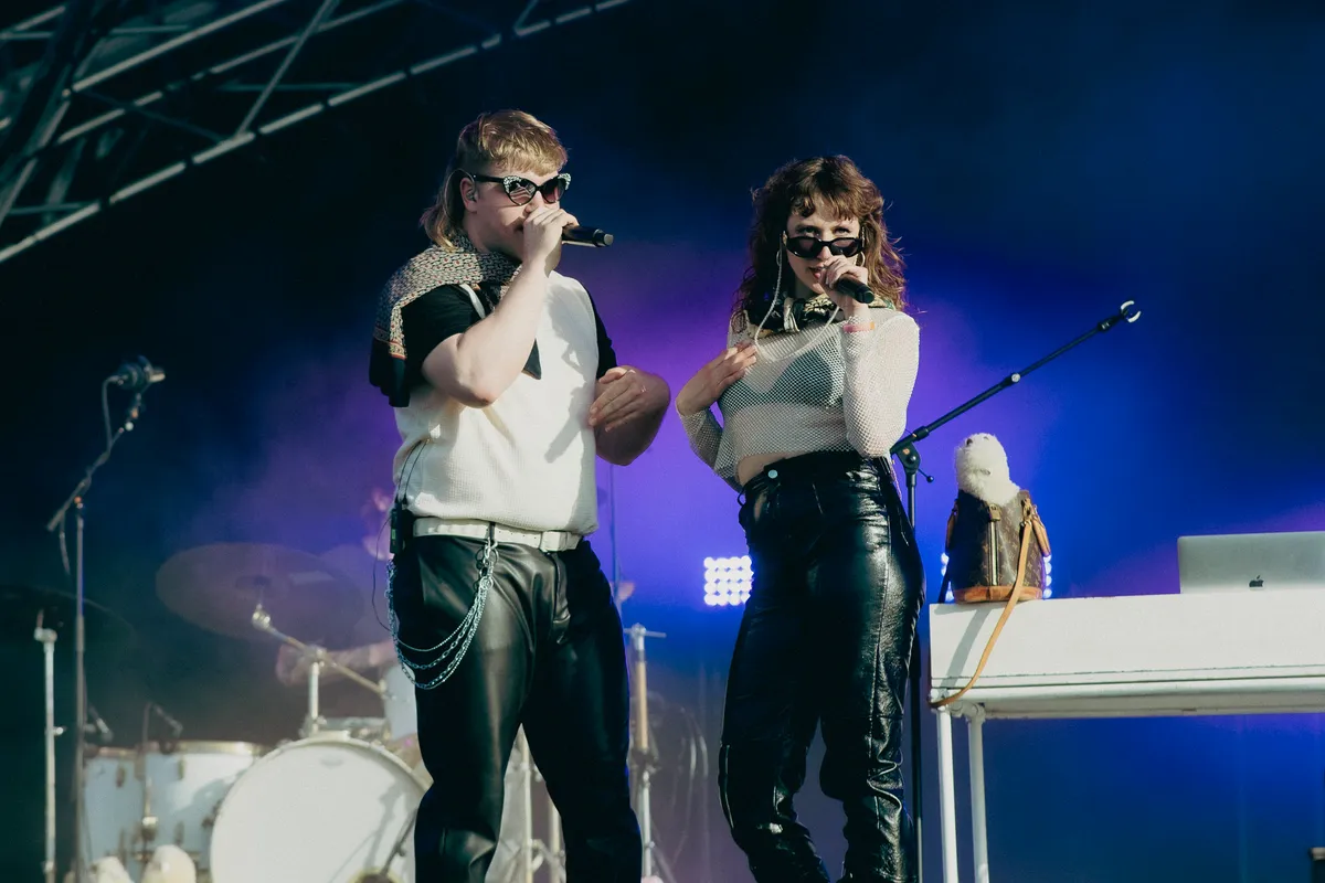 De eerste artiest die vanavond mag spelen is KUZKO. Al vooraf is het podium versierd met alpacaknuffels, en het belooft daarom ook in ieder geval een gezellig optreden te worden. Het is op het veld vooraan nog verrassend rustig wanneer de bandleden het podium betreden. Het duo heeft als begeleiding een drummer en een toetsenist meegenomen. Direct vallen de foute glitterpakjes van de twee vocalisten op, maar het valt ook op dat deze band vanaf het begin geen enkele fout maakt. De zang is zuiver en de muzikanten spelen elk nummer strak, maar zorgen ook dat er ruimte is voor plezier door het hele podium te gebruiken en door samen gesynchroniseerde danspasjes te doen. Ook de sketches tussen de nummers door vallen op, want die zijn in groten getale aanwezig, bijvoorbeeld wanneer de zangeres voor het nummer ‘Pills’ een pilletje aangereikt krijgt door de frontman, die ze met water doorslikt. Of bij het nummer ‘The Singer Wants the Drummer’, waar diezelfde frontman de zangeres aan het einde de backstage in tilt om pas een aantal minuten later terug te keren op het podium. Hoewel al die sketches tussendoor zouden kunnen afleiden van de show of lichtelijk ongemakkelijk kunnen zijn, is dat bij KUZKO geen enkel moment het geval. Voor het laatste nummer vraagt frontvrouw Danique het aanwezige publiek naar voren te komen, en gelukkig doet het Doetinchemse festivalpubliek dat, om zo nog één keer mee te kunnen springen op deze gigantisch leuke liveband.