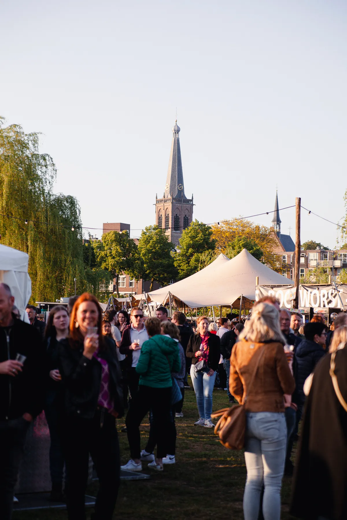 Met op de achtergrond de ondergaande zon en de kerk van Doetinchem belooft het een mooie avond te worden. Aan het begin is het nog rustig, wellicht omdat veel mensen net uit hun werk komen en eerst even willen eten. Gelukkig wordt het later op de avond drukker, maar propvol voelt het niet. En eigenlijk is dat ook wel prettig.