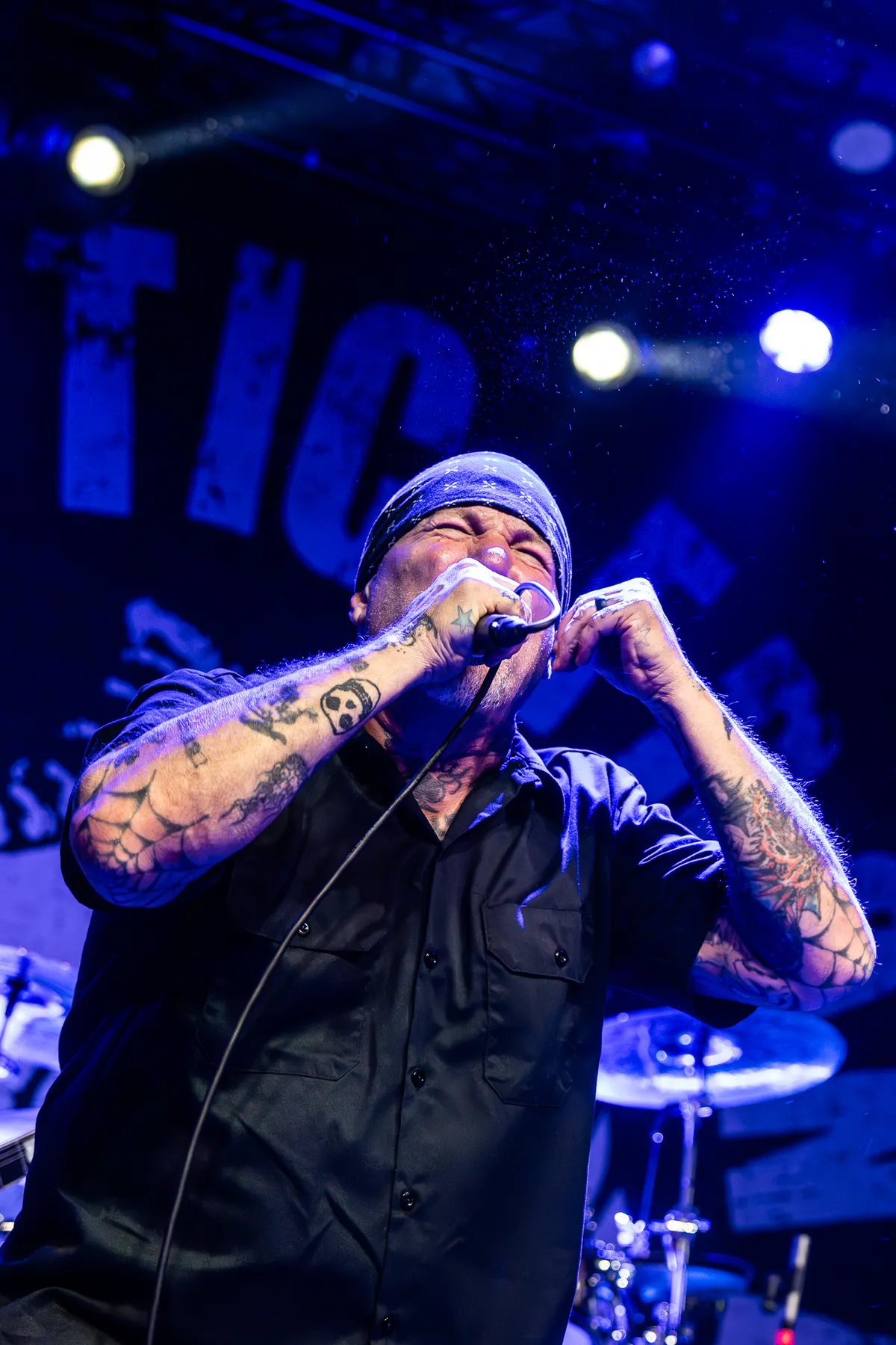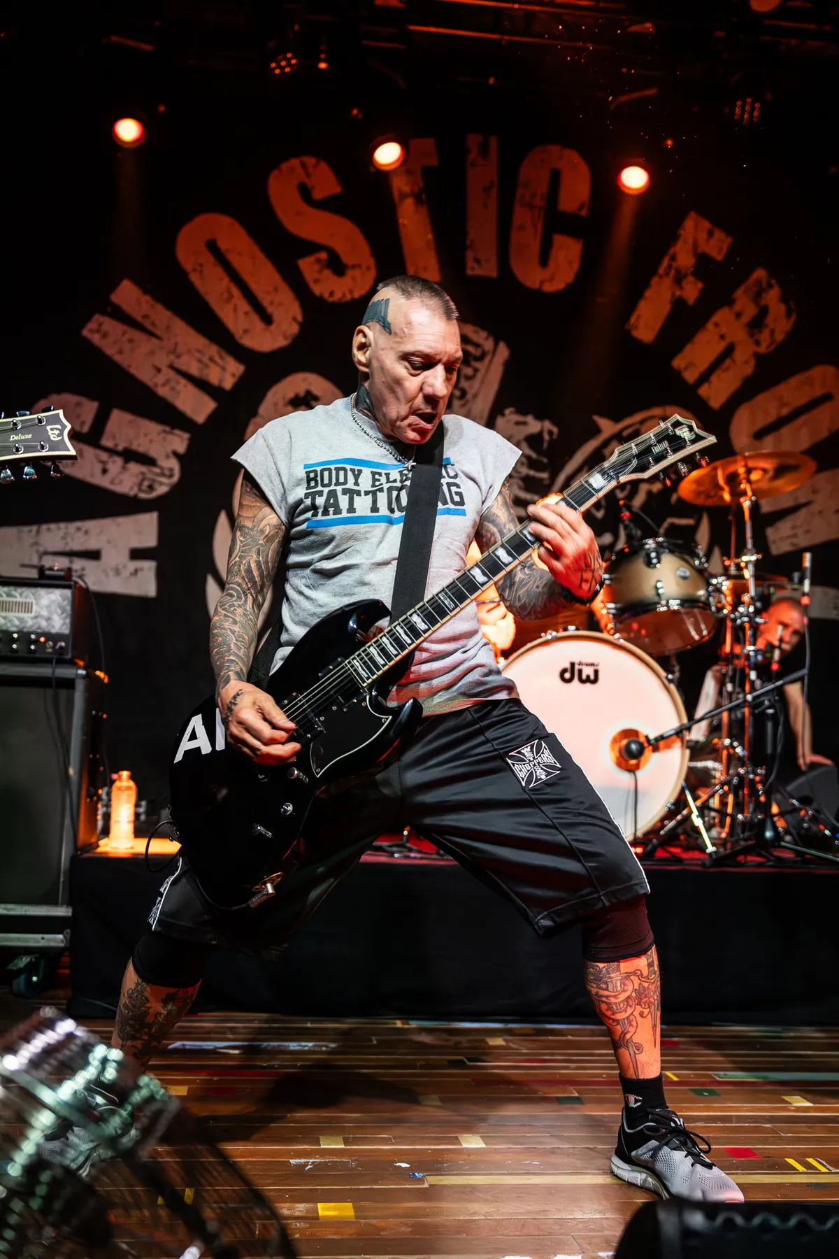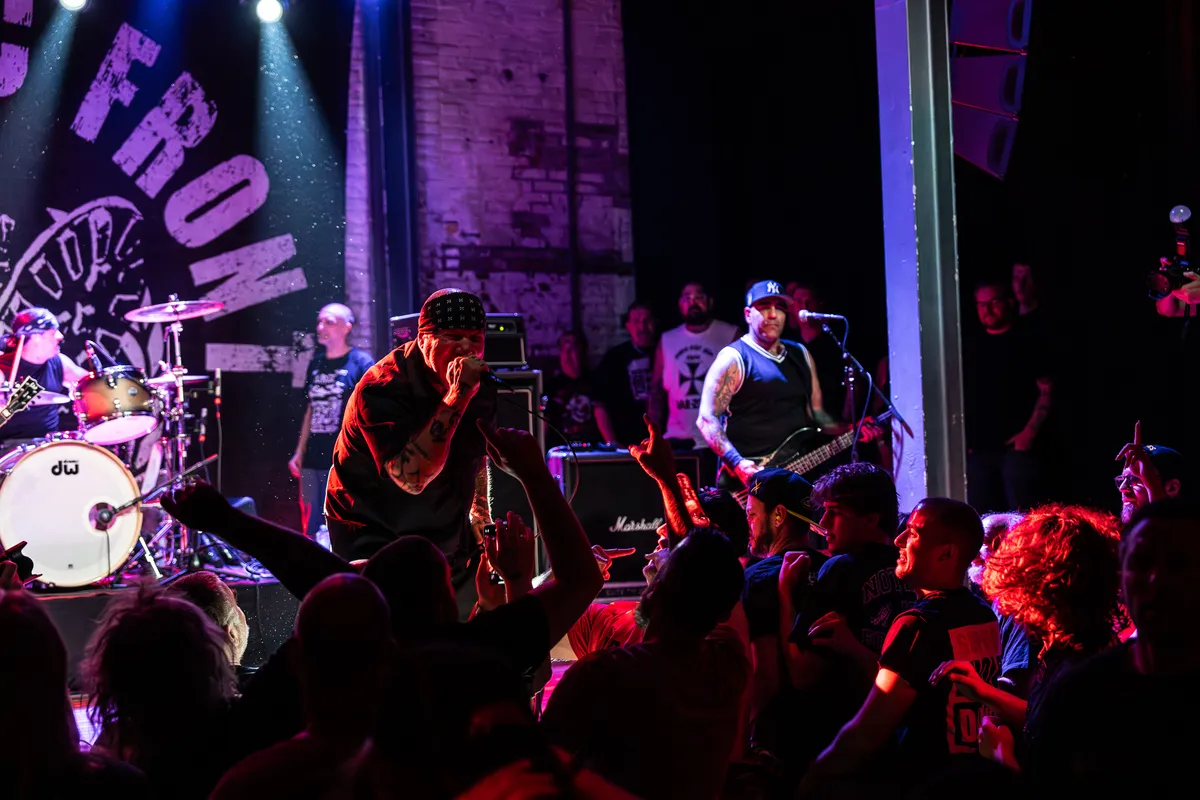 De eerste dag van de tour van Agnostic Front begint met een volle kleine zaal in de Muziekgieterij, en je voelt meteen dat er een ouderwets gezellige, feestelijke sfeer hangt. Als ze het tweede nummer inzetten en om een circle pit vragen, gaat de zaal los. Oud en jong feesten samen alsof er niets veranderd is. Vinnie Stigma (gitarist) steelt de show: hij springt van het podium en gaat midden in de pit staan terwijl hij het nummer inzet. De circle pit raast om hem heen.