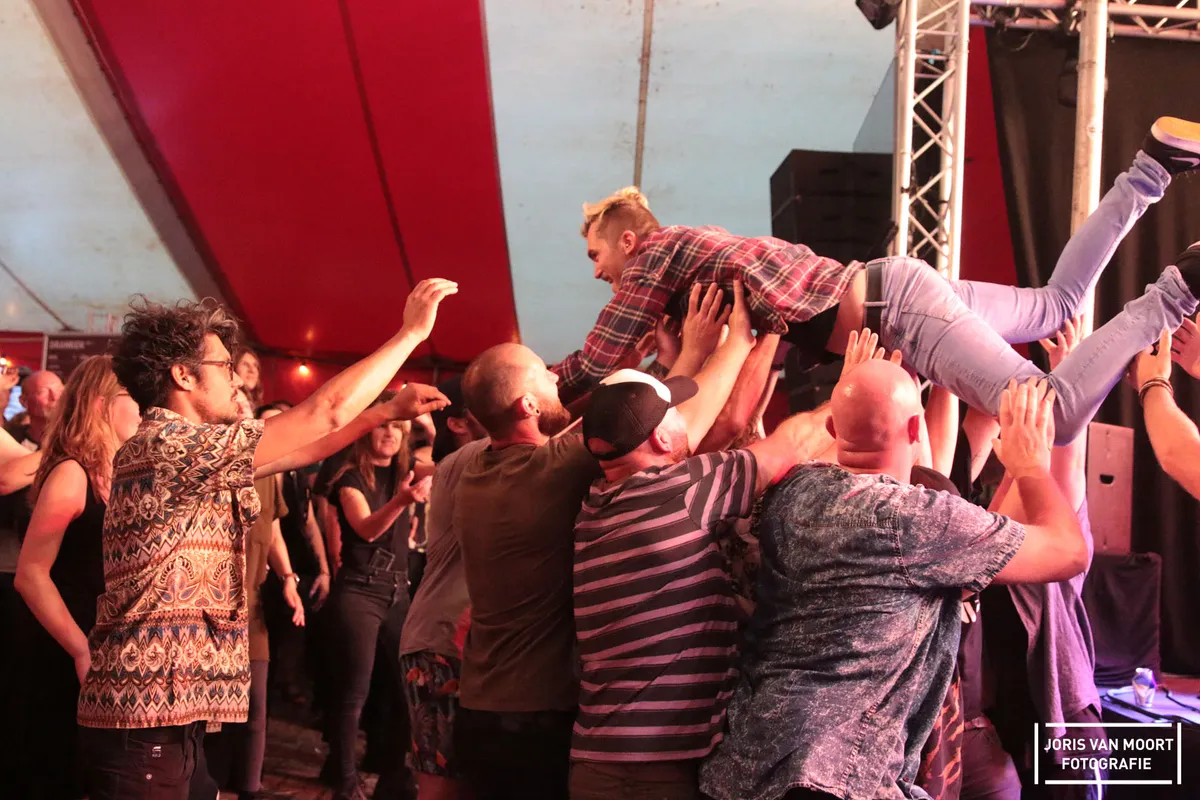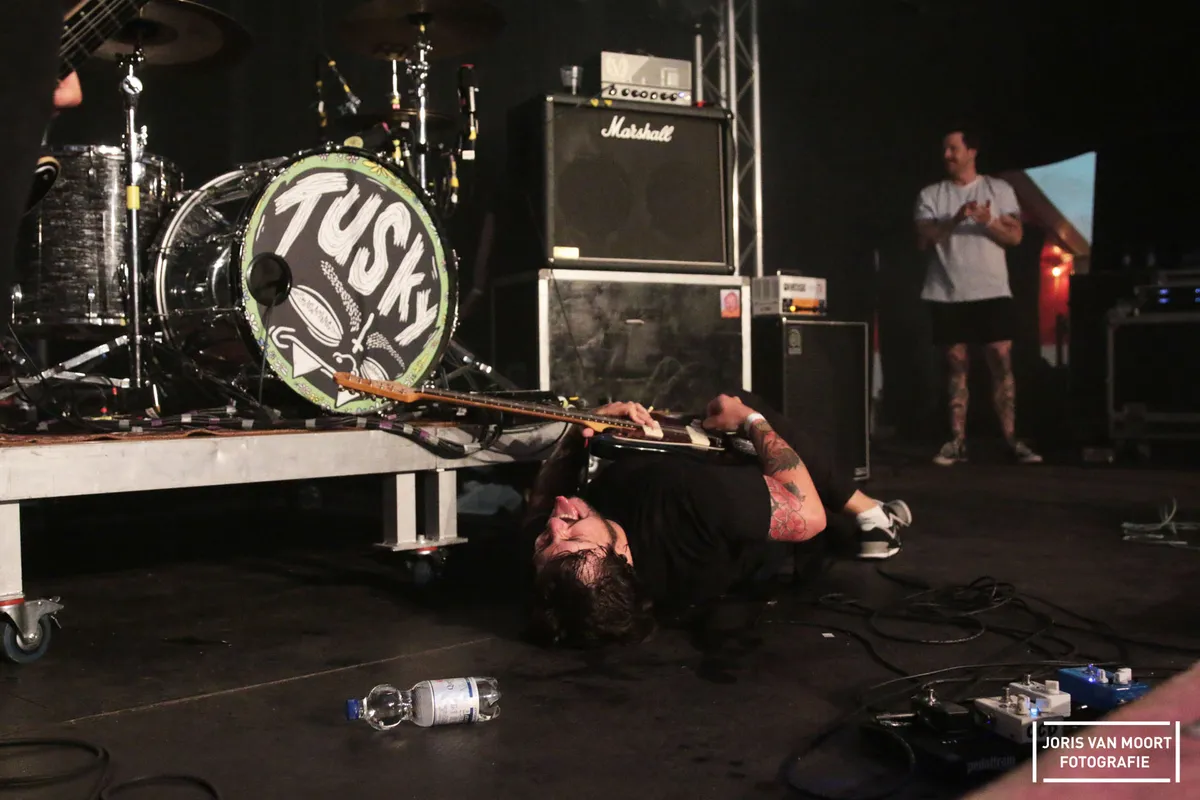 Een tikje harder en eigenlijk de headliner van de zaterdagavond is punkrockband Tusky. Tusky is ontstaan uit het ter ziele gegane John Coffey. Wat is dit vet! Al vanaf het begin van hun show gaat het los. Een wall of death, circle pit, crowdsurfers en een stagediver; kortom; alle registers gaan open. Is dit alles? Tegen het eind wilt de zanger, Vladimir Stevic zelf ook nog even voelen om het publiek in de ogen te kunnen kijken en klimt van het podium af. Met wat hulp weet hij de show door te zetten, terwijl het publiek nog eens flink losgaat. Uitgeput ligt hij op het podium als het laatste akkoord slaat. Voor wie nog energie over heeft speelt in de zaal Banda Matatu. Voornamelijk instrumentale wereldmuziek, wat eigenlijk een vreemde eend in het programma is, al blijkt een beetje vreemd ook wel lekker. Coverband Bad Hair Day sluit het festival in de tent met een reeks covers af.