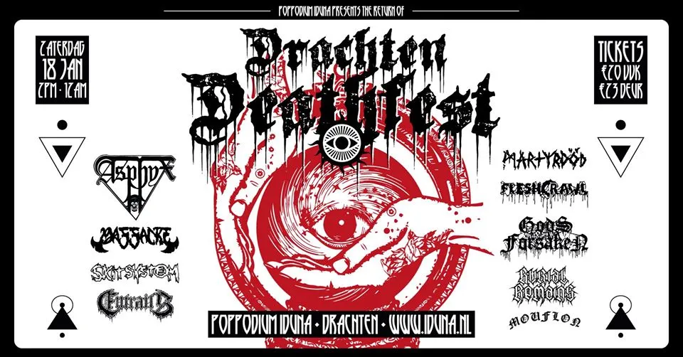 Voor het tweede achtereenvolgende jaar dat in Drachten Deathfest plaatsvindt, heeft de organisatie van Poppodium Iduna weer een trits aan extreme metalbands uit binnen- en buitenland bij elkaar weten te krijgen. Zelfs nog een tweetal acts meer dan op de vorige editie. En in de wetenschap dat in de voorverkoop al enige honderden tickets voor het festival waren verkocht, kan worden vastgesteld dat er op meerdere fronten goede zaken zijn gedaan. En met onder andere de uitsmijtende death metaliconen Asphyx en Massacre in de line-up, belooft het opnieuw een heftig en vurig metaldagje te worden.