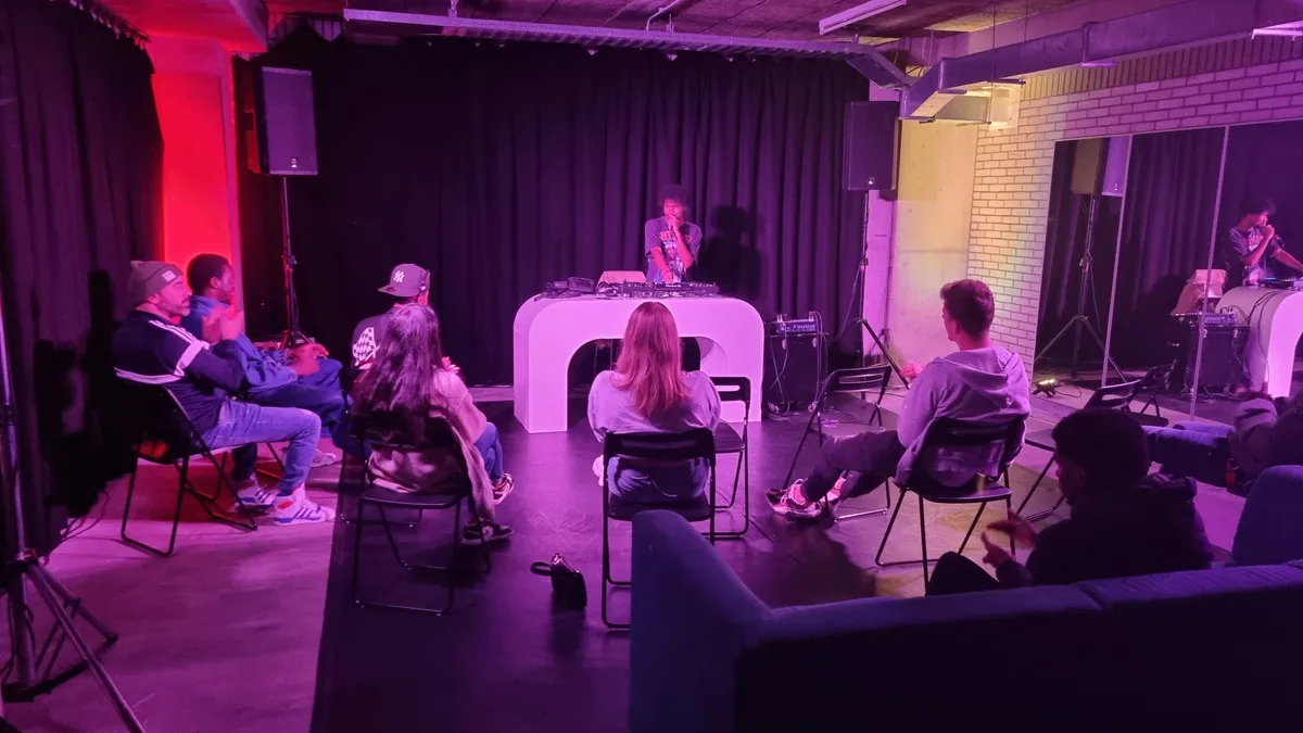 Nikola gebaart om zich heen. "Het zit fijn centraal, ook voor mensen buiten Nijmegen.” Het pand zit recht tegenover het politiebureau en Doornroosje en is goed te bereiken. Daarnaast hadden ze alle ruimte om het een en ander uit te proberen. "We hebben eerst een jaartje boven gezeten, op de derde verdieping. Daar hadden we eigenlijk een heel fijne sfeer opgebouwd. Helaas moesten we daar uit, omdat het COA erin moest.” Op termijn naar de kelder verhuizen, waar ze nu zitten, was al langer het plan. Maar zo plotseling was het toch nog even slikken. Joost vertelt dat de kelder op dat moment vooral bestond uit kale betonnen kamers en ruimtes vol met rommel. Inmiddels zitten ze er alweer twee jaar en worden steeds meer van die kale ruimtes omgetoverd tot studio’s. Of worden er geluidsdichte boxen neergezet die als studio gebruikt kunnen worden. Joost laat ook de dansruimte zien. Met geluidsinstallatie en spiegels, waar jongeren ook hun moves kunnen oefenen. Naast muziek is een clip en een performance ook belangrijk om goed te kunnen landen in de scene.