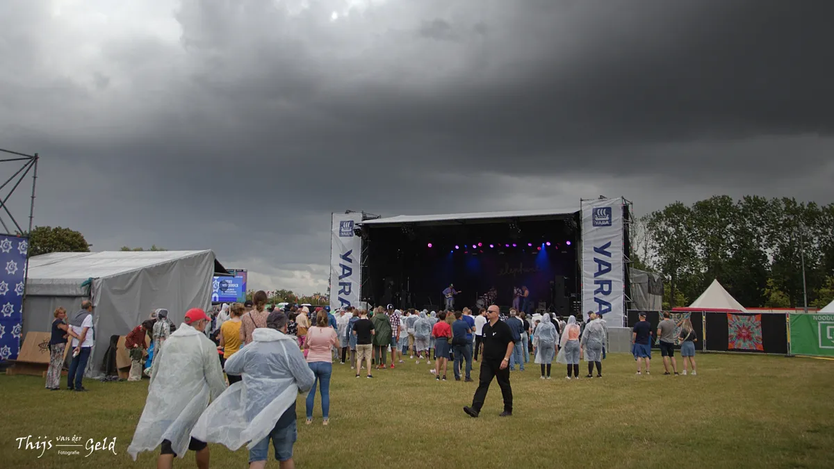 Terug het veld op voor iets meer reuring; Elephant. Ook deze groep muzikanten is nog niet zo heel lang bezig en hebben een bescheiden hitje te pakken met 'Hometown' en zijn uitgeroepen tot NPO 3FM Talent. Heerlijke muziek om te luisteren. Helaas valt het optreden letterlijk in het water, als het meermaals gaat regenen. Het aanwezige publiek bekijkt het optreden vanaf een afstandje.