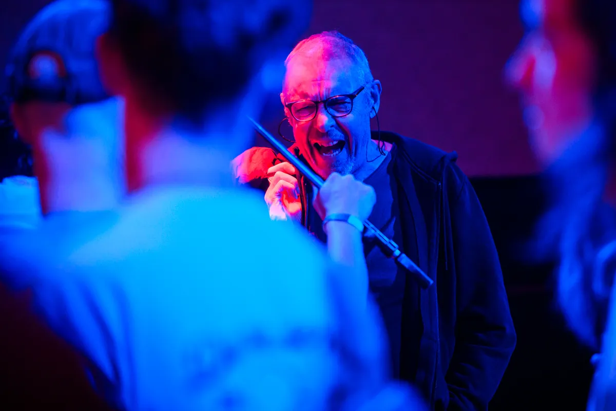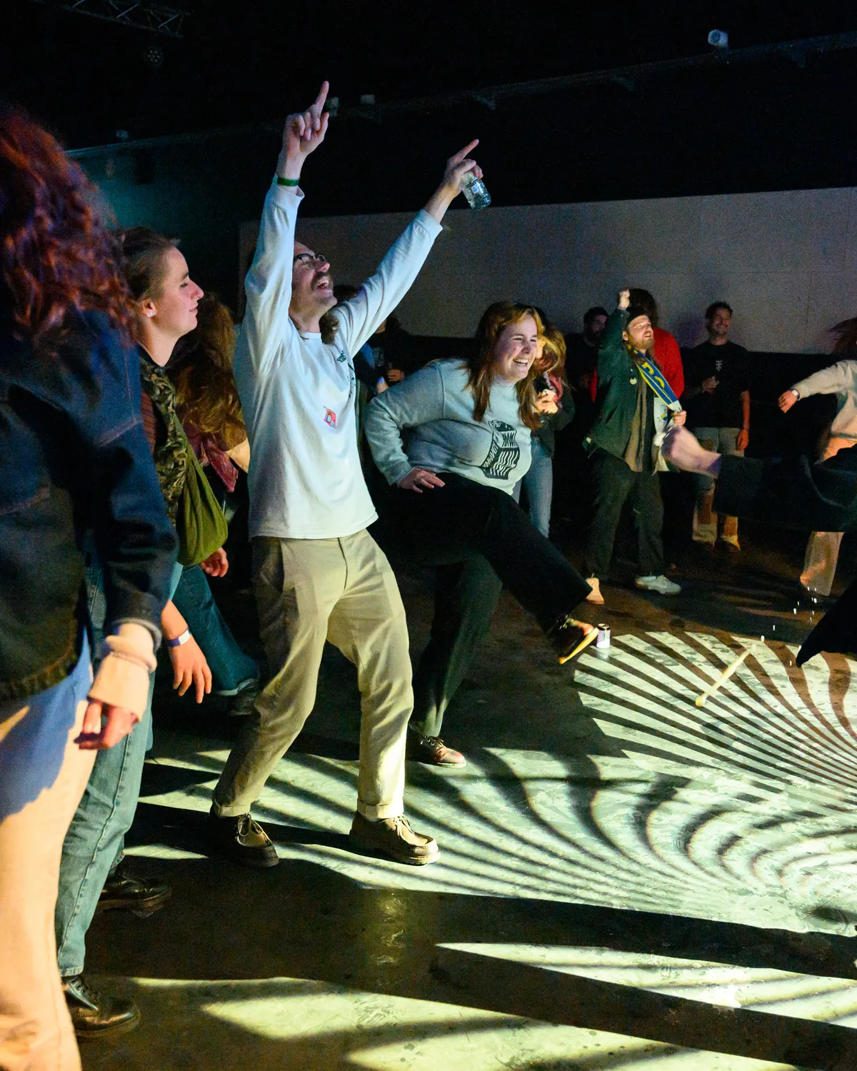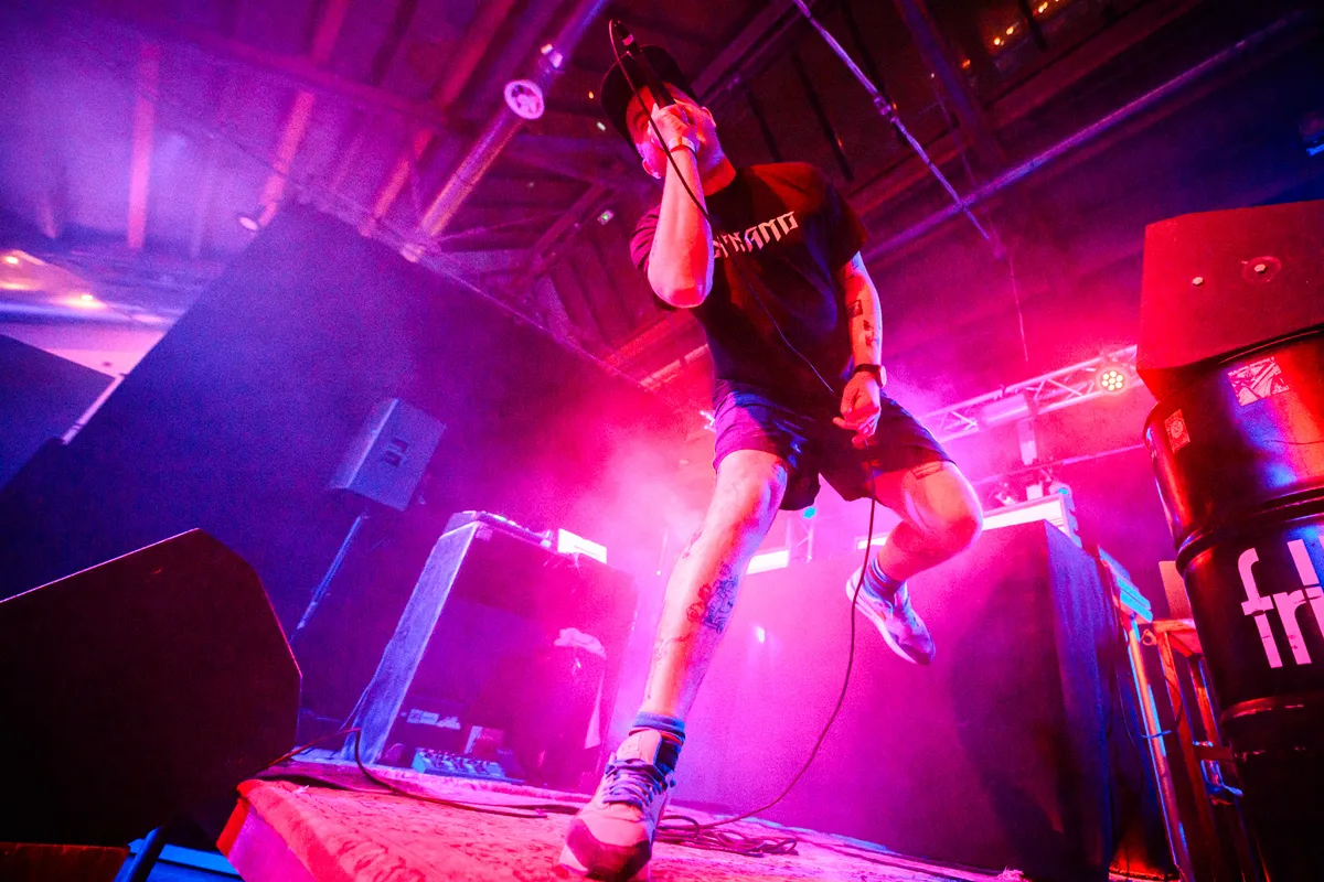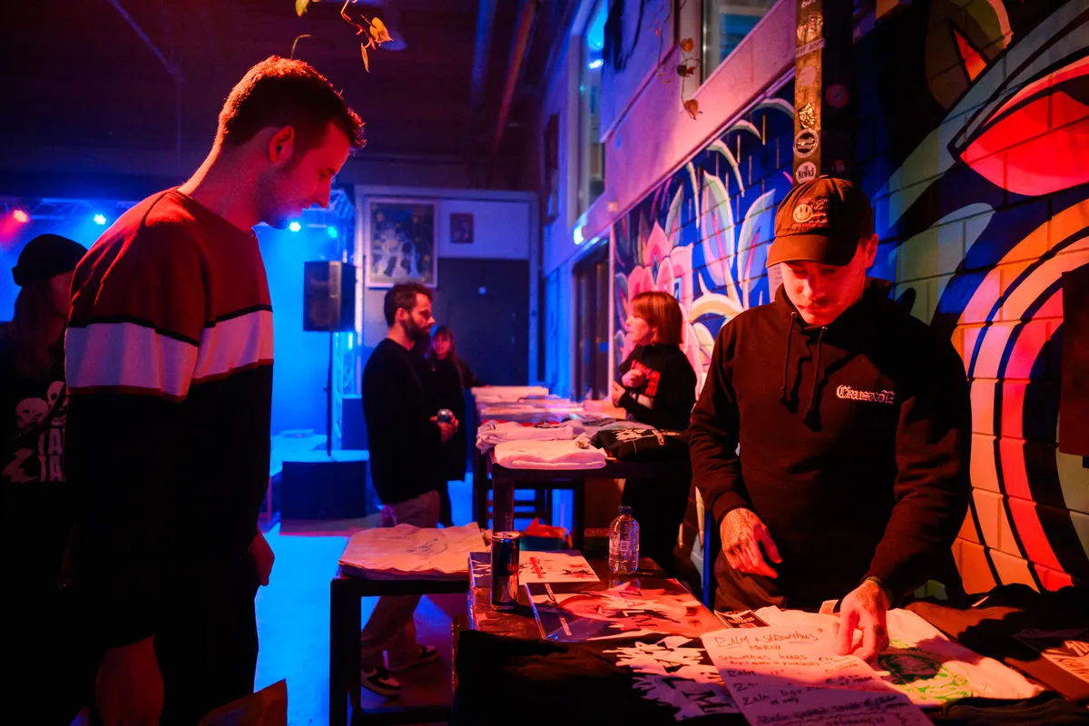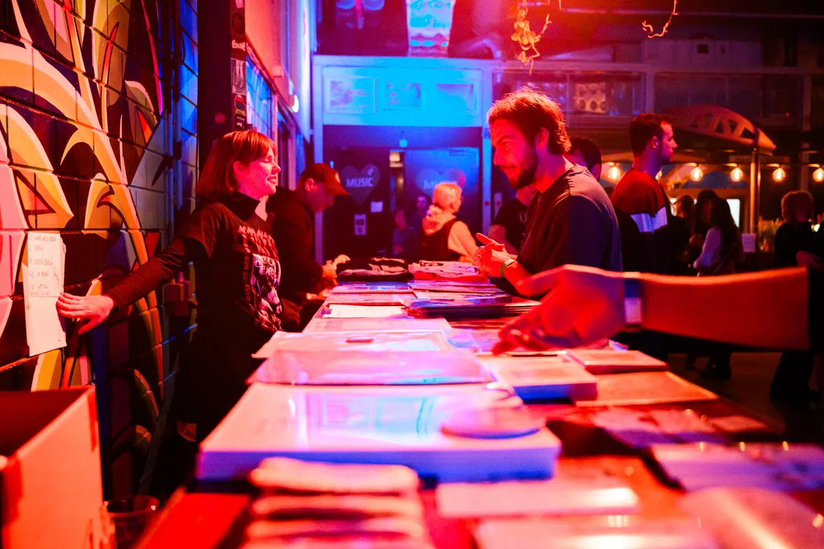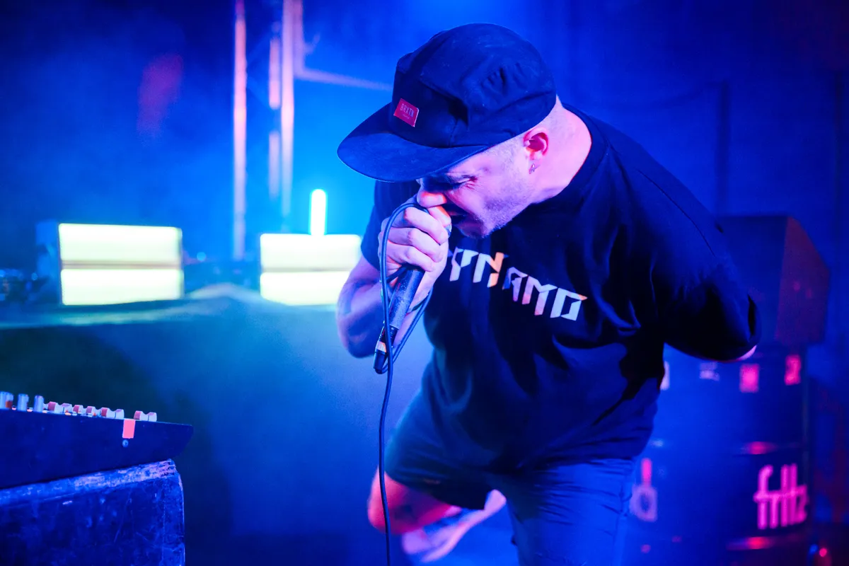 Dan snel naar de foyer waar het Docile Bodies dj-team al de hele avond banger na banger vuurt ('Mind's A Lie' van High Vis is zó goed) en een paar meter verderop bij de platenmarkt al het vinyl over de toonbank gaat, vaak met nét even wat extra centen op de basisprijs, want hier blijft niets aan de strijkstok hangen; alles komt ten goede aan de GoFundMe van Stroomhuis. Als dan vervolgens door een deel van het publiek de oordoppen erbij worden gepakt, kan het niet anders dan dat het tijd is vo-