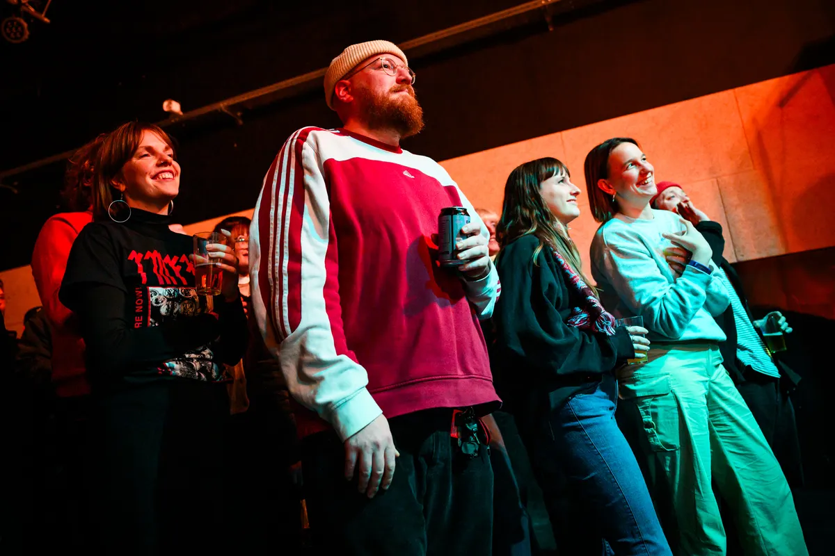 "Ik zal je eerlijk zeggen dat ik een beetje bang was dat er weinig animo zou zijn voor een Eindhovens initiatief in Tilburg." Een ongegronde angst van mede-organisator Joep Schmitz die tijdens GIRO040 in Hall of Fame van hot naar her rent, backstage van alles regelt en ergens toch nog de tijd weet te vinden om een praatje te maken met ogenschijnlijk álle ruim honderd bezoekers. Dat die elkaar allemaal ook weer kennen, spreekt boekdelen over niet alleen het ons-kent-ons gevoel, maar ook over de solidariteit voor Stroomhuis, waarvan een aantal medewerkers hier ook aanwezig is. Zij staan hardop te genieten van GIRO040, gooien de armen nog eens in de lucht als de dan spelende act iedereen nog eens aanspoort om te doneren en van een bedompte sfeer is de hele avond dan ook geen sprake, laat staan een gebrek aan animo.