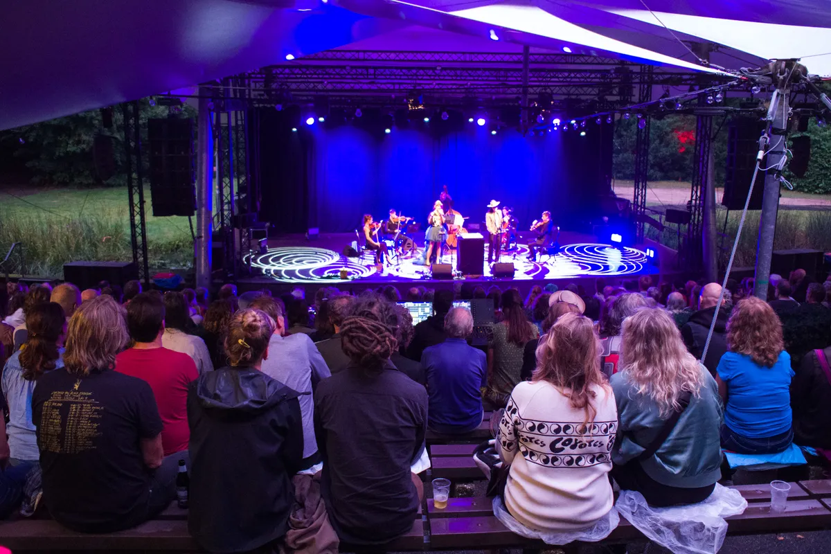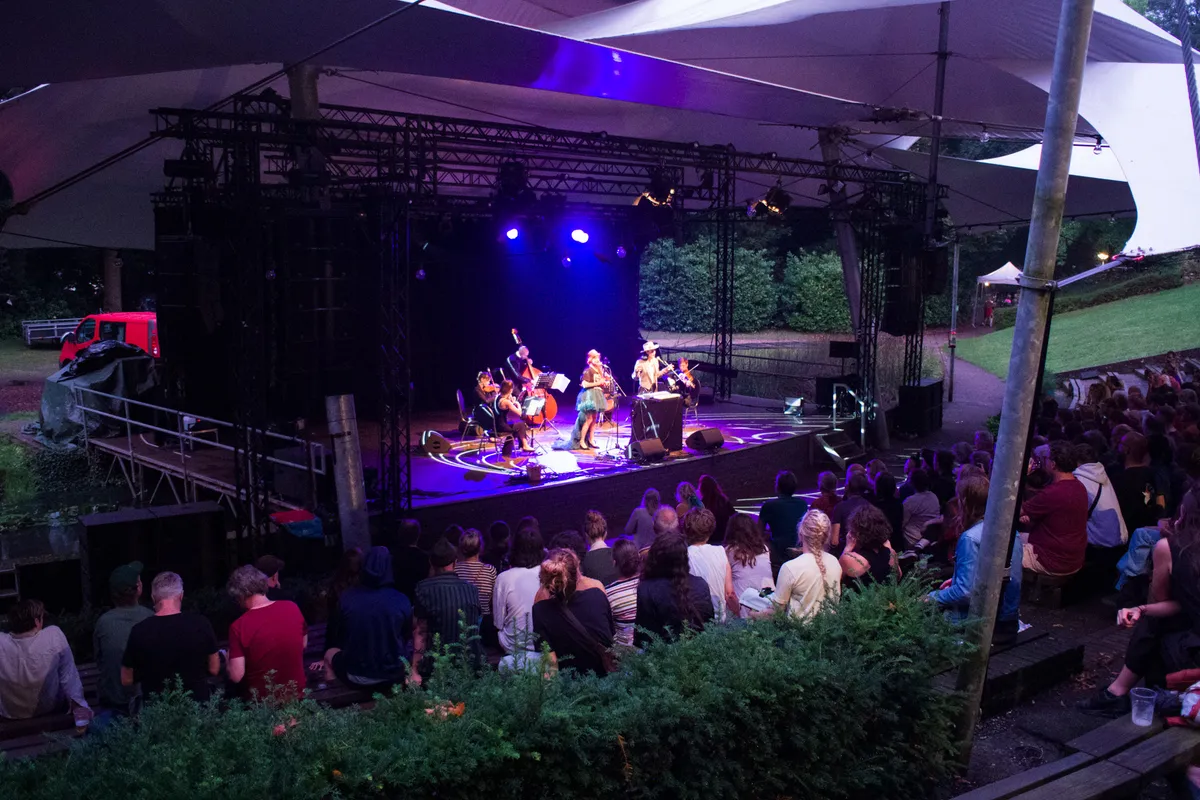 Het zomerse weer nam de afgelopen dagen een grillige wending en gisteravond was men op deze locatie nog genoodzaakt het optreden van Xavier Rudd te annuleren in verband met naderend onweer. Na een vochtige dag is de regen inmiddels opgetrokken in de Nijmeegse bossen. CocoRosie is al hun hele carrière een acquired taste geweest, maar hoewel de tribunes vanavond zeker niet vol zitten, zorgt de getrapte bouw van het amfitheater dat dat nauwelijks te merken is. Er zitten mensen tot voorbij waar de lichten reiken. De langzaam invallende duisternis zal de beleving de verdere avond alleen maar intiemer maken.