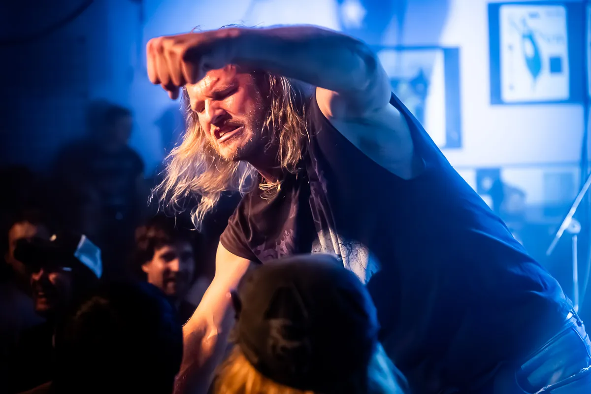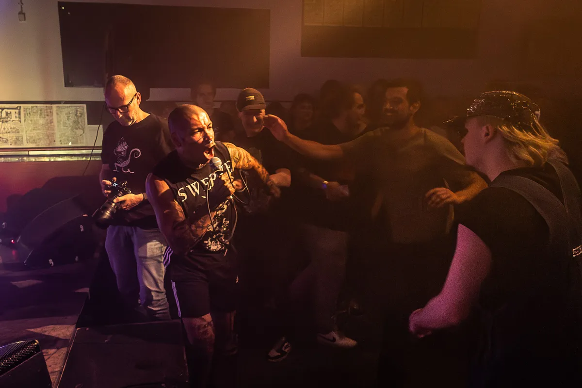 Afgelopen mei kwam de debuut-EP van Crucified uit: Restraints. De band bestaat uit vijf al wat oudere klaplopers (hun eigen woorden) die muzikaal beïnvloed zijn door jaren-80-schizofrenie en doomachtige paranoia. Olav, Renard, Coppie, Juju, en Freek staan klaar op het podium. Crucified opent met een soort intro-nummer, waardoor er in zekere zin sprake is van een opbouw in de set. Al wordt er daarna toch weer vlot tot de kern doorgedrongen. Bij hardcore punk zijn de metalinvloeden niet ver weg: headbangen en agressief moshen gaan hand in hand. De nummers van Crucified kennen lekkere trashy elementen, en tempowisselingen die je hard proberen te raken. De zanger is hier dan geen strijdende stormram, maar met zijn beukende heimachine-bewegingen weet hij bij velen in het publiek de adrenaline verder op te pompen. Je krijgt onweerstaanbaar de neiging om minstens je vuist de lucht in te gooien en mee te schreeuwen.
