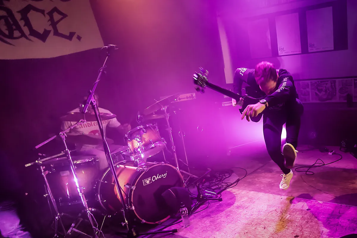 Zanger Noa is een vervaarlijke strijder, hij kijkt alsof hij van plan is als een stormram met sprintsnelheid de zaal in zijn eentje omver te beuken. En als het eerste nummer los gaat doet hij dat dan ook. Het geluid is bij het prille begin heel even slecht. Maar intens is het. Zodra we wat gewend zijn aan de klanken horen we een soort screamo hardcore punk on speed. Het geheel is zwaar aangezet. De zang is soms bulder-schreeuwend, dan weer krijsend, en we verstaan er geen bips van. Mooi! Er is veel energie op het podium, en er is direct goeie waanzin in de zaal.