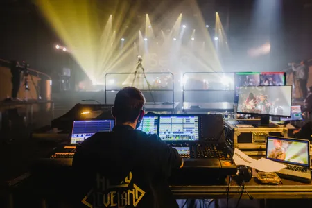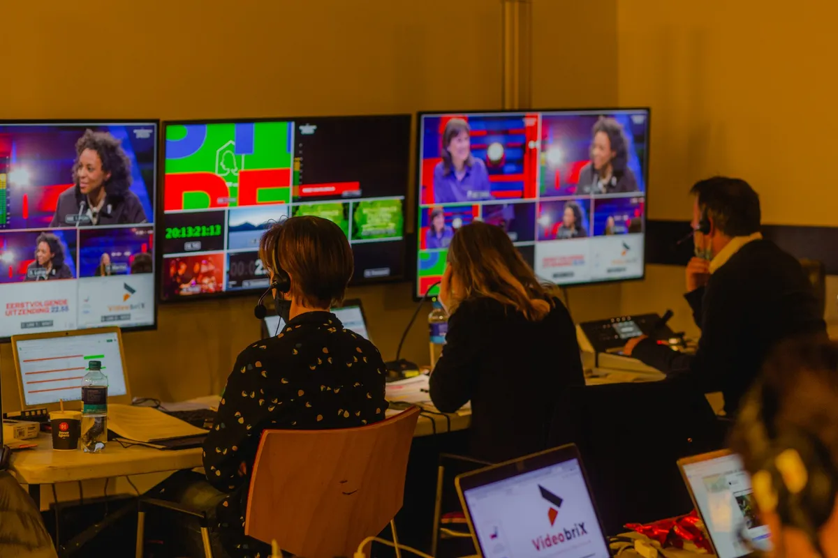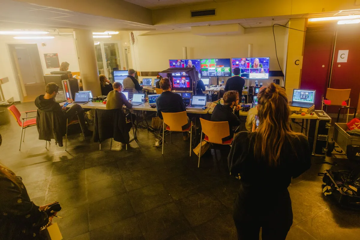 In de tijd dat we ons naar beneden verplaatsen, is het interview met Nana Adjoa en S10 al begonnen. In het backstagegebied vinden we, naast een vrijwel verlaten artiestenfoyer, een stuk omloop dat als hoofdregiekamer is ingericht. Op bij elkaar zo’n twaalf computer- en laptopschermen wordt het gesprek, dat momenteel één verdieping boven ons in de Grote Zaal gaande is, in de gaten gehouden. Terwijl S10 met presentatrice Brecht van Hulten over haar mentale gezondheid praat, wordt er achter de twaalf schermen alleen sporadisch gefluisterd. En dat geldt eigenlijk voor alle acts. Alle woorden die vandaag op het podium worden gewisseld, raken vandaag de grijze vloer van de Ronda. In plaats van tweeduizend man staan er nu drie verhoginkjes met camera’s erop. Het geluidspaneel is vandaag uitgebouwd tot een extra groot bureau met daarop drie grote beeldschermen voor zaalregie.
