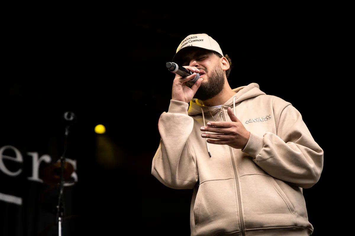 Dat is ook zijn muzikale boodschap vandaag in Utrecht. “Participeer, wees geen omstander, ook opstandig zijn is meedoen”, vertelt hij aan de bezoekers bij het hoofdpodium. Samen met zijn driekoppige band (dj, drummer en toetsenist) begint hij rustig. Misschien is het ook het spannende gevoel om voor het eerst in twee jaar weer te spelen en op zo’n groot podium te staan. Samen met zanger/rapper Shadi neemt hij ons mee in een set die zowel serieuze tracks als olijke nummers bevat. Grappig moment is wanneer Fresku de bekende Utrechtse strijdkreet “Uuuuu!" aanhaalt, en op het moment dat de bezoekers die overnemen ‘Zeg maar gewoon jij’ zegt.