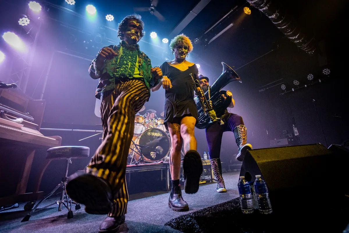 Cockaphonix serveert een muzikale cocktail die smaakt naar een stoffige saloon ergens in het Wilde Westen, met een scheut straatjazz uit New Orleans en een flinke plens circuspunk. Denk: zwalkende ragtime, schurende koperlijnen en een ritmesectie die klinkt alsof hij elk moment uit de bocht kan vliegen — maar dat nooit doet. Het is gecontroleerde chaos, gebracht met een grijns. De band werd in 2017 opgericht als duo door “Rayko Stanislav” (Raymond Malstead) en “Holiday Dan” (Daniel Koenig). Met een honderd jaar oude piano en vintage drums bouwden ze aan een luide, onconventionele set die inmiddels is uitgegroeid tot een volwaardig muzikaal spektakel. Later sloten Chris Nobbs (trombone), Roly Espino (trompet) en Nathan McCartney (tuba) zich aan om de kopersectie te versterken.