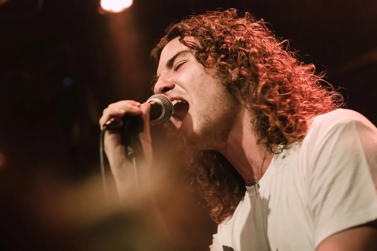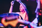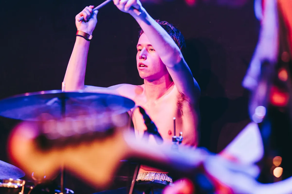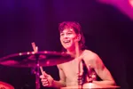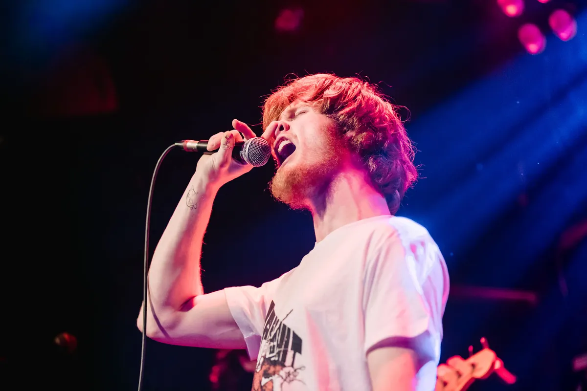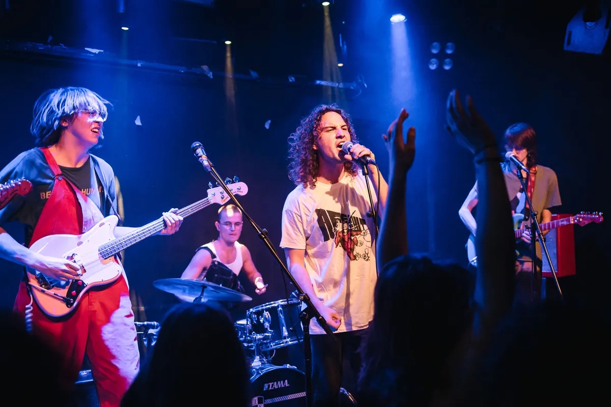 Een uurtje later is het tijd voor de lijm die deze avond alles verbindt. De leden van de postpunkband Bowl leerden elkaar kennen op de Herman Brood Academie in Utrecht en momenteel werken ze hard aan hun debuutalbum. Zanger Vos Ploeg begint de show met een rustig solomoment in zijn Apeshit shirt. Al snel wordt hij ondersteunt door een strakke ruggengraat van drums en bas, met daarbovenop genoeg zigzaggende gitaarladdertjes die je hoofd van alle kanten prikkelend binnendringen. De gitaar-gevulde opbouwen hebben wat weg van een energieke indieband als Parquet Courts en de repeterende loopjes die we in veel hedendaagse post-punk horen zijn ook zeker niet te missen. Niet alleen is Bowl in staat om voor een chaotische moshpit te zorgen, ook zijn hun bas riffjes opzwepend en stilstaan lijkt onmogelijk.