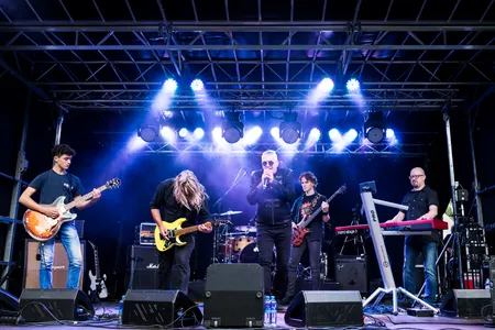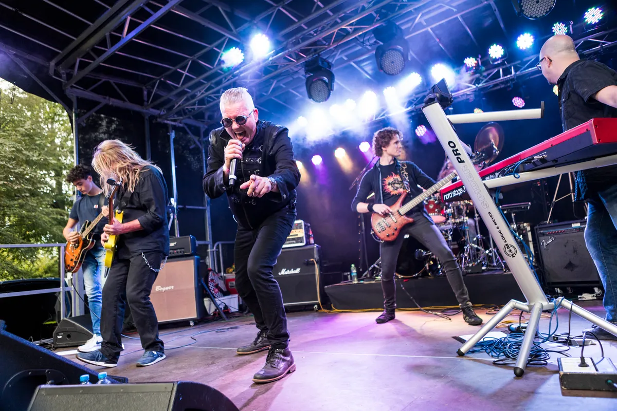 “We gaan het droog houden!” roept de zanger op deze regenachtige dag. Hierna spelen ze een nummer van hun album ‘New Eternity’. De instrumenten drum, gitaar, bass en keyboard vormen een stevige basis voor een goede rockband. Dat is ook zeker terug te horen in de harde, maar goede muziek. Hoewel de zang wat wisselend is. Sommige mensen beginnen mee te bewegen, er zijn tijdens het gehele optreden vooral veel knikkende hoofden te zien. “Ik hoop dat we nog heel veel jaren voor ons hebben” wordt er gezegd waarna er ruimte wordt vrijgemaakt achter het drumstel. De band heeft twee jonge talenten meegenomen als support: een 14-jarige drummer neemt plaats en speelt het volgende nummer mee. Dit doet hij super goed en er is zelfs weinig verschil te horen tussen het jonge talent en de vaste drummer Hans in ‘t Zand. Hierna speelt er nog een jong talent de sterren van de hemel op gitaar.