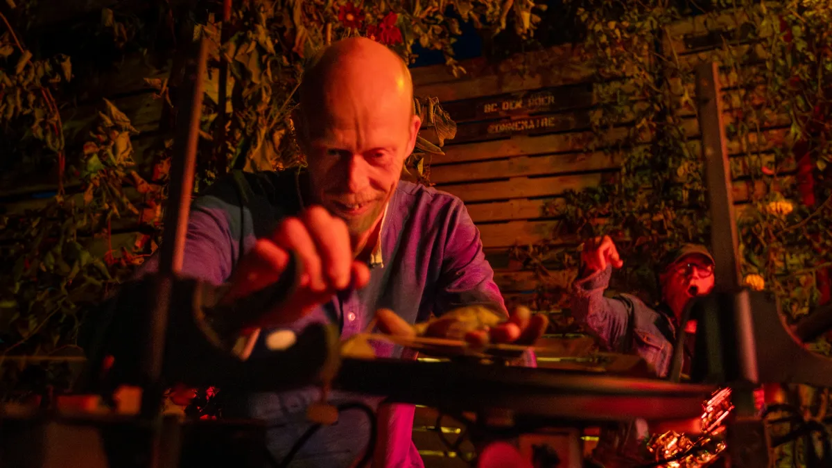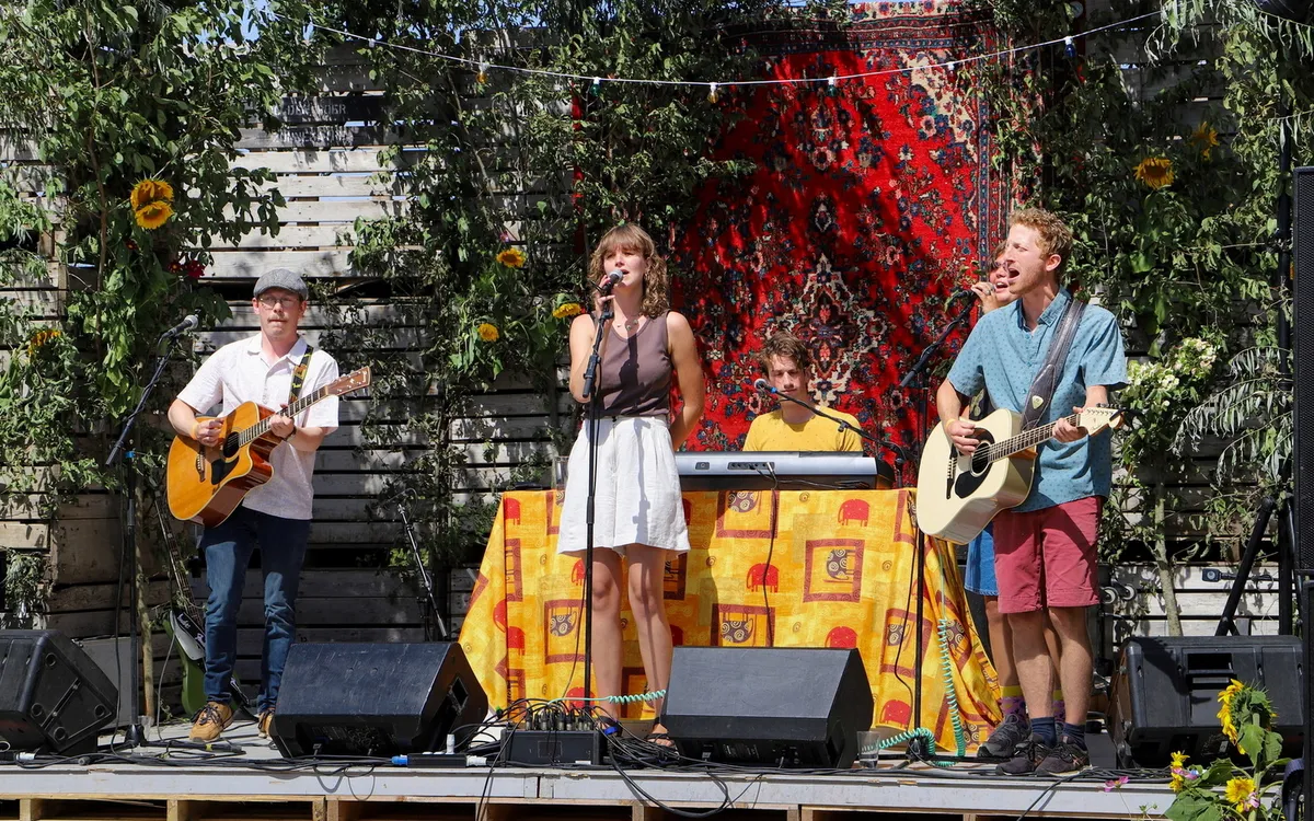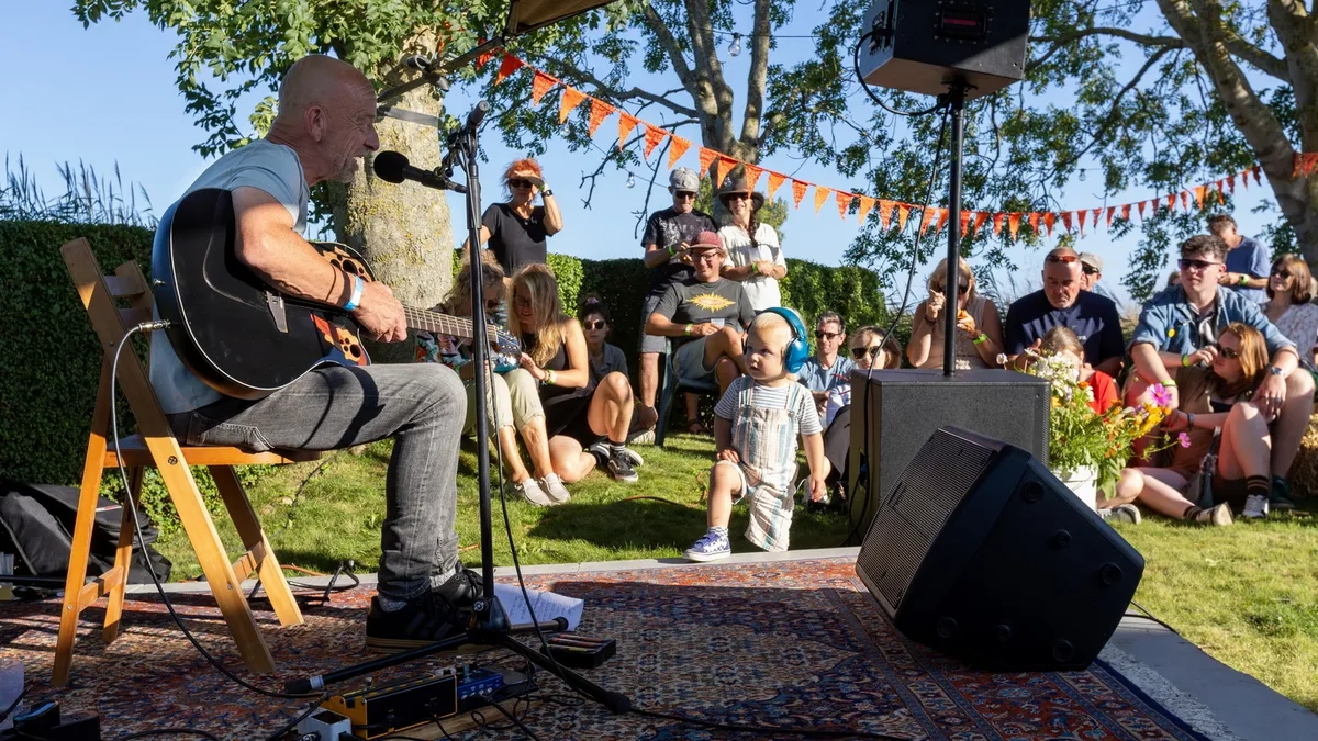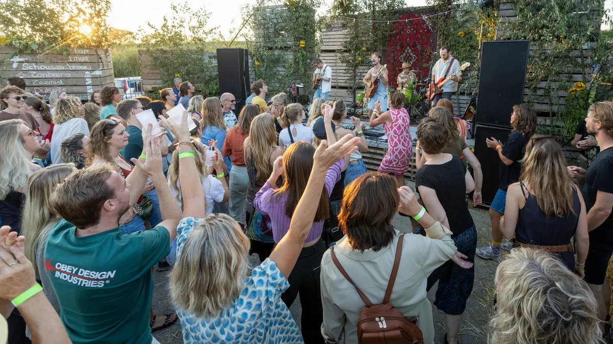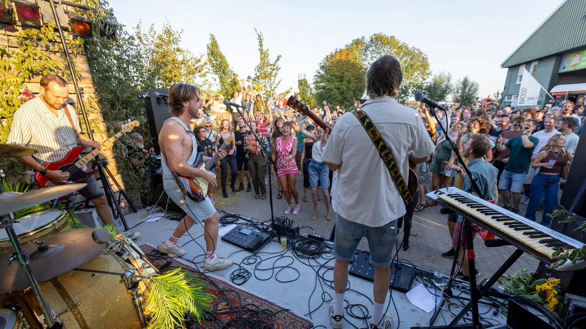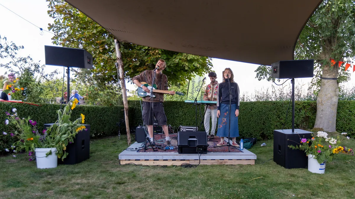 In de schuur draait DJ Rubse terwijl op het tuinpodium Simon Stuij met zijn band dromerige indieliedjes brengt. Driestemmige zang en teksten over water, landschap, lente en tijd: een moment van bezinning. “In het donker kun je licht goed zien,” krijgen we als boodschap mee. Het gaat over de reis naar jezelf, in De lange omtrekkende beweging. Het publiek luistert aandachtig, terwijl elders op het terrein wordt gedanst en bijgepraat.