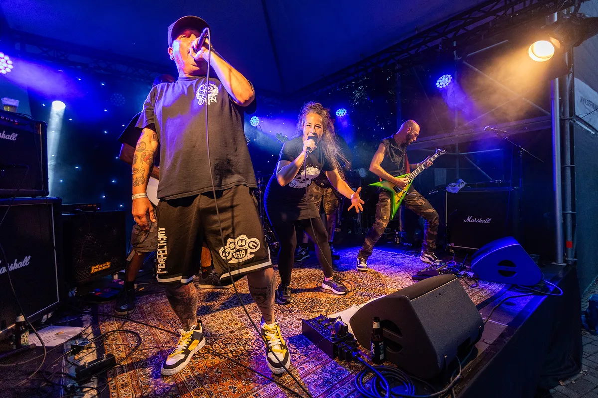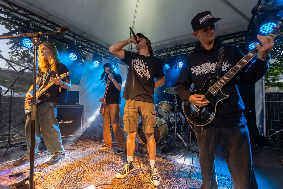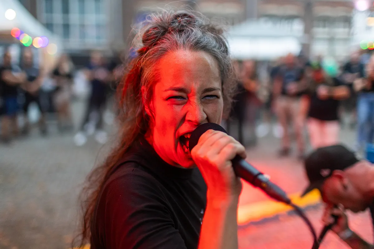 Van nuance geen sprake bij dit viertal uit Hasselt. De muziek is niet in een hokje te duwen en als we het dan toch moeten proberen dan vatten we het samen als: intelligente herrie. Zanger Fenne Gerets lijkt op het eerste oog zeer lief, maar als hij zijn strot opentrekt dan lijkt het alsof we in een heftige episode van Stranger Things terecht zijn gekomen. De demogorgon wordt op ons losgelaten. Hun debuutalbum kwam in maart uit en kreeg goede recensies van de Belgische metalblogs en vandaag maakt Parkstad kennis met Lintworm. De band trapt het gaspedaal meteen volop in bij het eerste nummer ‘Thanks For The Socks’. Zanger Fenne hypet zichzelf compleet op en springt uit stand nog net niet zo hoog als Armand Duplantis. Voor de leek lijkt het alsof de band aan het jammen is, maar als je beter luistert, dan hoor je de intelligentie in de vreemde riffs in combinatie met de afwisselende drums en de mega gevarieerde stem. Hier is gewoon goed over nagedacht. Het publiek lijkt het nog niet allemaal te begrijpen, maar een eerste date is meestal even aftasten en daarna zal de liefde volledig tot bloei komen. Lintworm zet je constant op het verkeerde been en dat is precies waar het deze band om te doen is en dat voelt verdomd lekker. (BH)