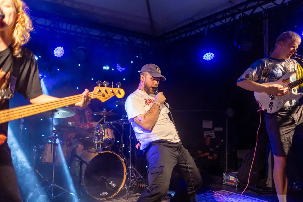 Met nummers als ‘Riestevlaai’, ‘Kauw Sjotel’ en ‘André Rieu’ weet Zjwieg als punkband moeiteloos de aandacht te trekken. Helemaal wanneer je hoort hoe de band tot stand kwam: een groep vrienden die, na een avondje stevig drinken, besloot een band te starten waarin elk lid een instrument zou bespelen dat hij of zij nog nooit had aangeraakt. Na de releaseparty van hun nieuwe album Höb geer auch sjoes in Volt, Sittard, is het vandaag de beurt aan Bunkerpop voor dit Limburgse punkfeestje. Vanaf het moment dat Zjwieg het podium betreedt, spat de energie ervan af. Hun nummers zijn kort en krachtig — zo is ‘Mesjtreech’ na 13 seconden al voorbij, gezongen door de frontman die de microfoon letterlijk in zijn mond stopt. Het nummer ‘Jeuk 2’, een parodie op Tracy Chapman's ‘Fast Car’, bevat teksten als: “Ich höb jeuk aan miene zak” en het mag duidelijk zijn dat Zjwieg zichzelf vooral niet te serieus neemt. Hun muziek is een chaotische, rommelige rollercoaster waarin de zang vaak te wensen overlaat, maar dat lijkt niemand te deren. Deze band weet hoe je een feestje bouwt! Bij het nummer ‘Piepesjtele’ wordt het publiek zelfs uitgenodigd om mee te doen aan een ludiek dansje. Het feest is pas echt compleet als ‘André Rieu’ gespeeld wordt, waar de mensen vooraan in het publiek één voor één “Andre Rieu is unne wiekser” mogen meebrullen. We zijn ervan overtuigd dat iedereen na afloop met een brede glimlach staat, want muzikaal perfect hoeft het niet te zijn als je zoveel plezier weet te verspreiden. (AW)
