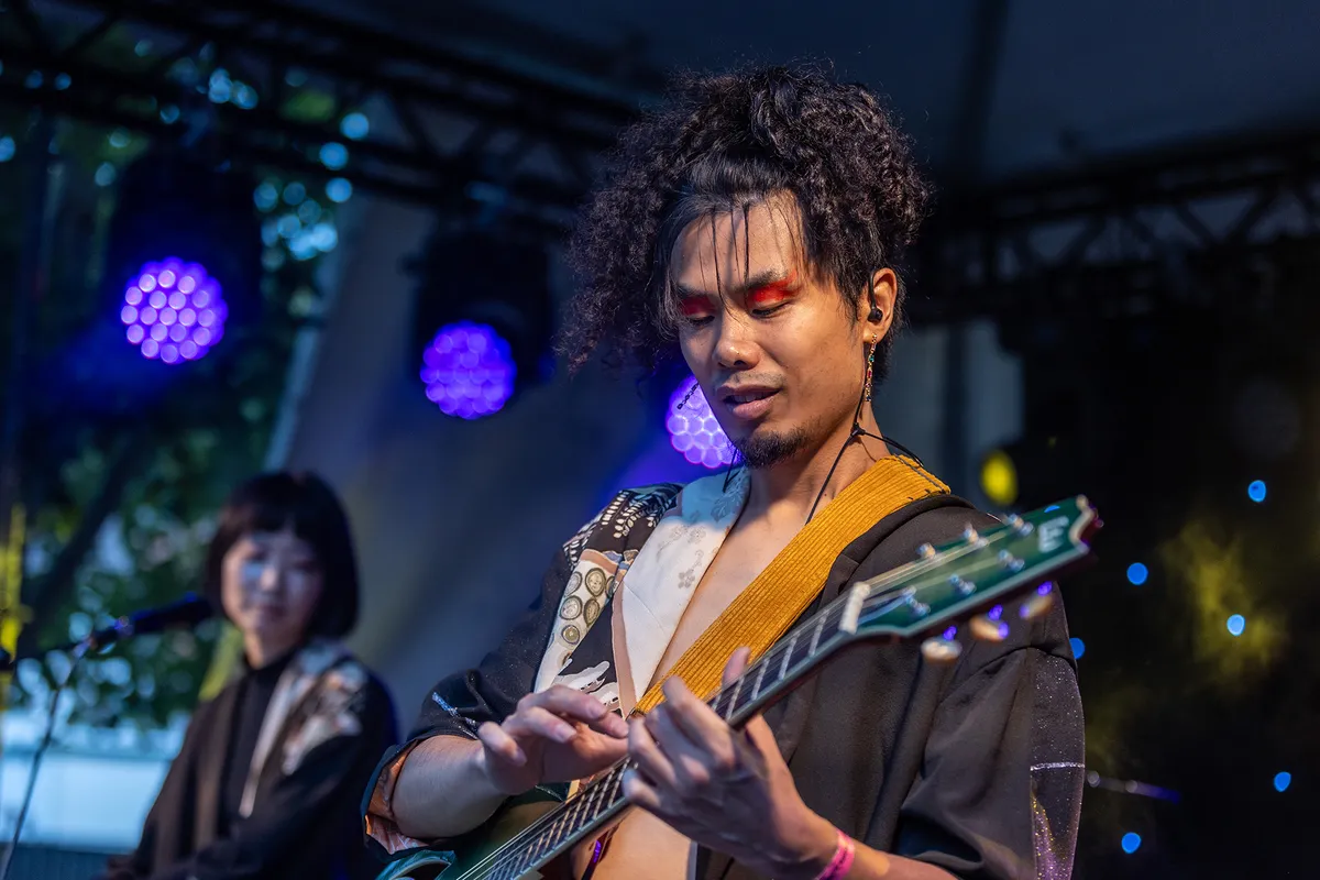 Elk festival heeft een act die je mag bestempelen als “de vreemde eend in de bijt”. Op deze editie van Bunkerpop is dit het Japanse duo Enjaku Yoyo. Ze wonen al een hele tijd in Nederland en willen van hieruit de rest van het westen veroveren. De muziek is super creatief en origineel. Het is elektronisch, dansbaar, exotisch en donker. Tussen alle gitaren in is het een verademing om even met de voetjes van de vloer te gaan in de invallende schemering. Het optreden lijkt uit één lang nummer te bestaan, waarbij we door de voortstuwende beats gedwongen worden om mee te bewegen. Het gitaarspel is bijzonder technisch en zeer geraffineerd. De piano zorgt voor de tegendraadse melodie tussen de beats. In hun bijzondere outfits en met hun bescheidenheid krijgen ze de mensen vooraan mee en wordt er voor het eerst echt gedanst. We krijgen hele sterke Moloko vibes en zomerse gevoelens bij dit optreden. Na een mooi stukje publieksparticipatie wordt er met een welgemeend “arigato” afscheid genomen. Enyaku Yoyo was bijzonder en interessant. (BH)