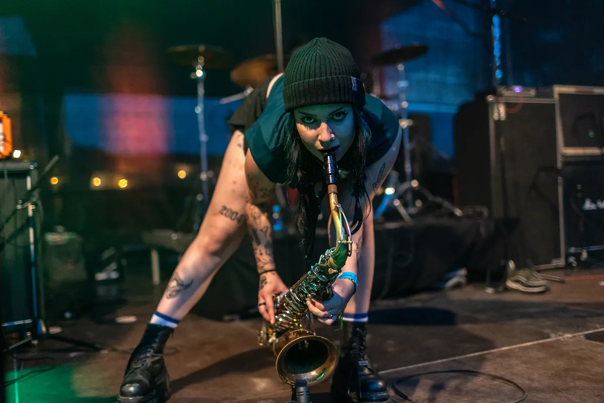 Volslagen waanzin uit Bristol. Dit zeskoppige noisepunk collectief deinst nergens voor terug en schiet scherpe teksten op je af over onderwerpen als homo- en queerfobie en politiek. Naast de typische bas, gitaar en drum, beschikt de band over een saxofoniste, die met haar spel een extra laag chaos aan de muziek toevoegt. Hoewel er nog geen volledig album is, beloven de eerste singles en de EP What We See in Their Eyes vuurwerk. Op het podium zien we een bont gezelschap dat heel veel zin heeft om Landgraaf plat te spelen. Zanger Jay Schottlander is de excentrieke frontman en zijn zang klinkt als een lange, staccato speech met een incidentele schreeuw ertussen. De rest van de band houdt het tempo er goed in en de interactie tussen de bandleden is aanstekelijk. Voor het nummer ‘Headcase’ gaat het shirt van Jay uit onder luid gejuich van het publiek en applaus van de overige bandleden. Hij steekt een sigaret, op gaat als een volleerd model op een van de voorste speakers staan en kijkt ons strak aan. “I am an arrogant fuck,” roept hij ons toe, terwijl het nummer in een soort operette eindigt. Bij ‘Doppelgänger’ gaat de band helemaal los en draagt elk bandlid vocaal zijn/haar steentje bij. Het optreden wordt beëindigd met een cover van Kate Bush. ‘Babooshka’ klinkt bijna onherkenbaar, maar in deze uitvoering blijft hij ook tussen je oren hangen. Deze band heeft de gunfactor en we hopen ze dan ook snel weer terug te zien in de buurt. Amazing! (BH)