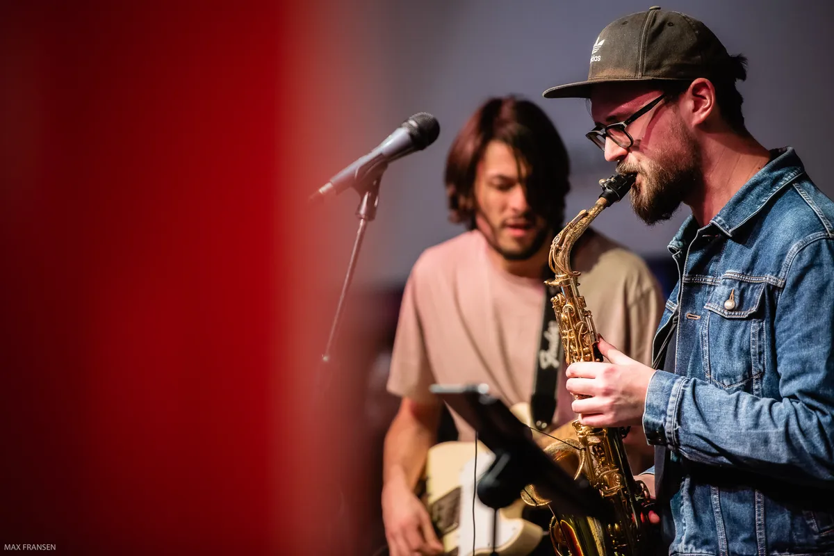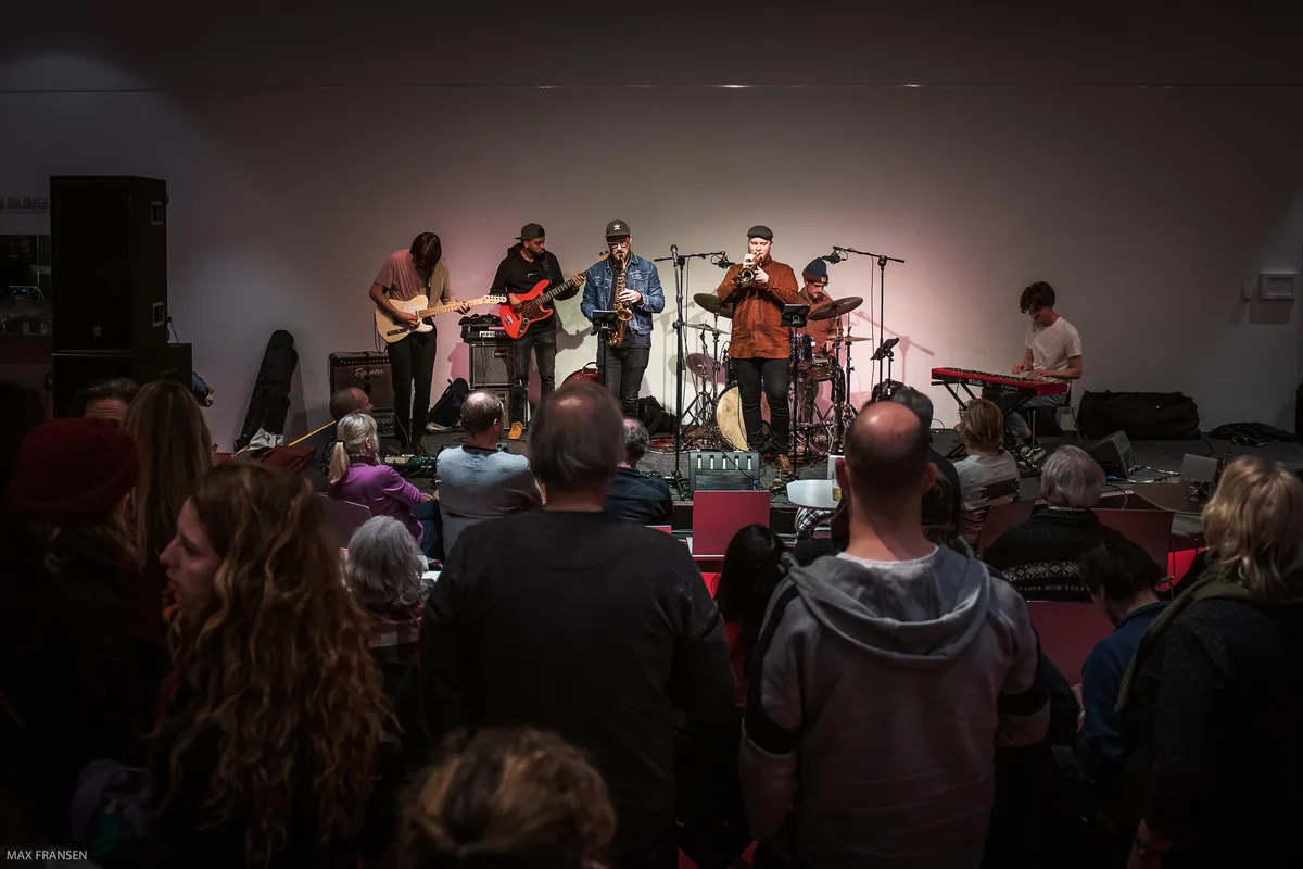 Met Peuk nog schreeuwend en knallend in ons hoofd stappen we het Chassé Theater binnen, voor een afzakkertje bij Filet Au Fonque. Deze van oorsprong Bredase jazz/funk-band speelt in de foyer van het Chassé Theater. Die is om 22:00 uur zeer, zeer goed gevuld. Mensen zitten voor het podium aan tafeltjes, leunen op de bar, zitten op de grote roodfluwelen trappen of staan bijna tot aan de achterwand opgesteld. Is dit dé finale van Cultuurnacht Breda waar de stad voor uitloopt? Ja en nee.