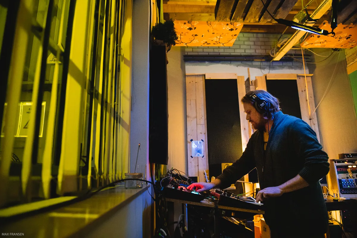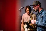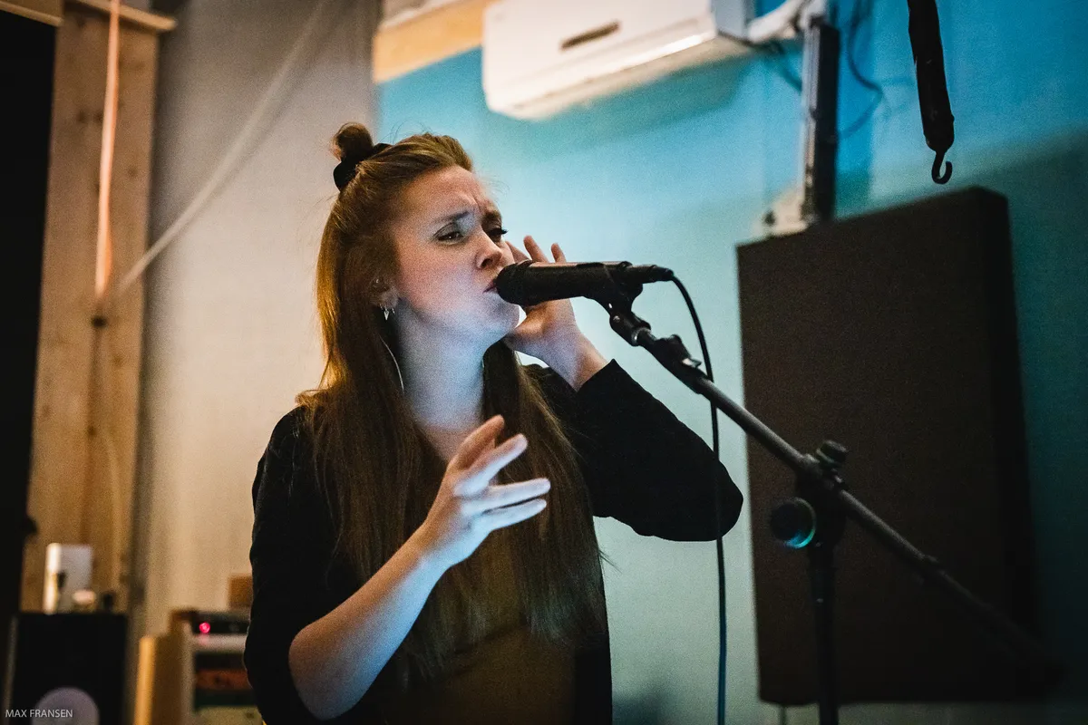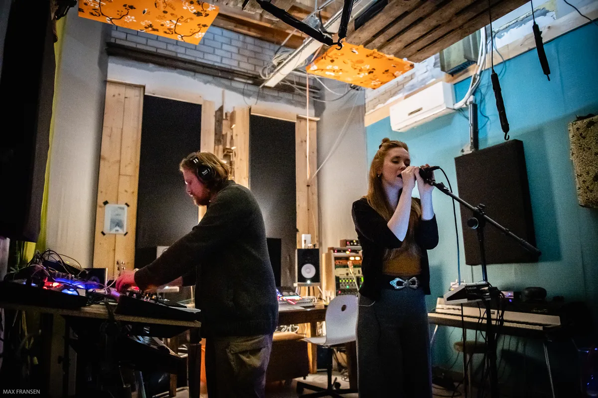 Rubah, dat is theatermaakster en zangeres Roxane Clijsen en producer Bram Schouw. Ze brengen in Studio Solo, Brams werkplek in A-Broad, de hele avond korte indrukken als showcase van ‘Volle Angst Vooruit’. We zagen eerder de sterke single met STEEV al voorbij komen. De ruimte doet industrieel aan, hoog en donker. Toetsen, een Rhodes en opnameapparatuur langs de wanden. Bankjes tegen de wand bij de deur, koptelefoons, de microfoon in het midden naast een houten xylofoon en andere attributen. De ruimte is nieuwsgierig makend ingericht…