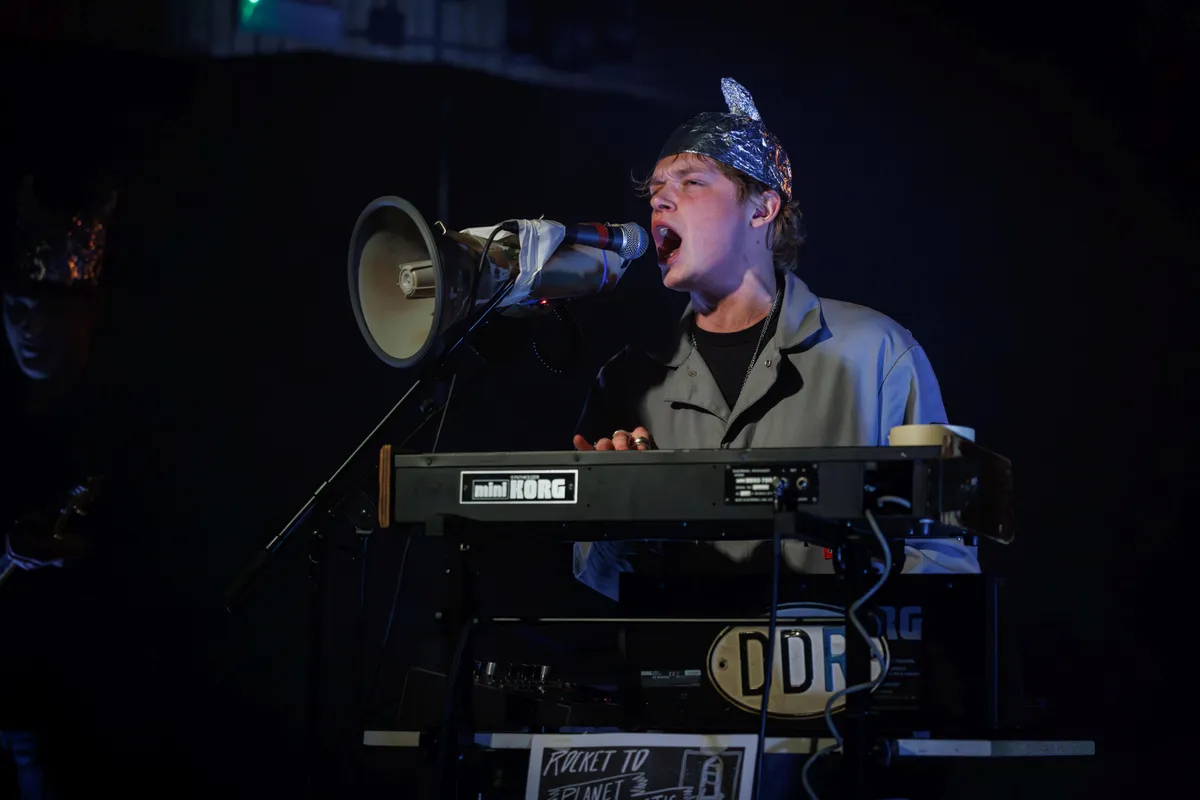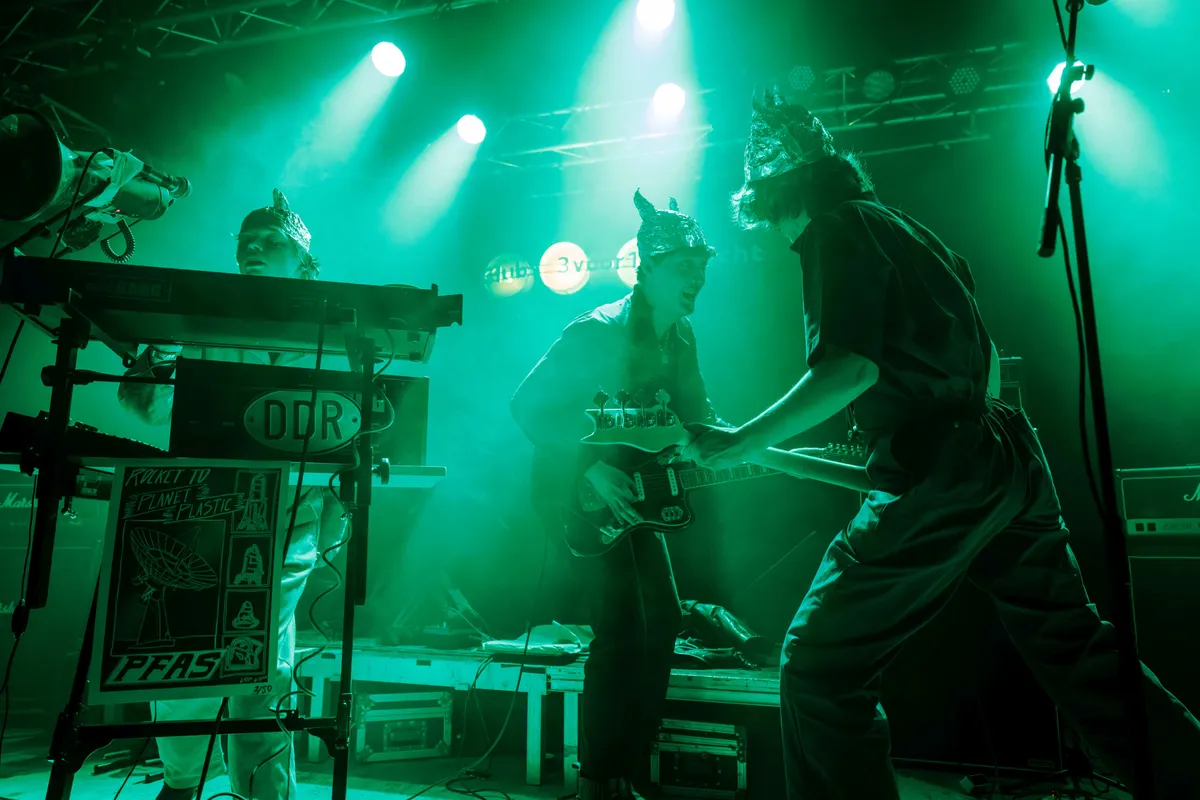Gewapend met vikinghelmen van aluminiumfolie betreedt eggpunkband PFAS het podium. Na een droge, ingestudeerde introductie, waarin alle drie de bandleden om de beurt een woord zeggen, barsten ze los met een flinke dosis energieke punk. Af en toe schreeuwt frontman Sander iets door de megafoon die met tape op zijn microfoon geplakt zit. De band gebruikt een drumcomputer in plaats van echte drums, en dat geeft precies het synthetische PFAS-laagje dat deze punkband zo bijzonder maakt. De nummers gaan over NASA of over honden – een uitgebreidere introductie krijgen we niet. Ze gaan zo hard dat de geluidstechniek hen af en toe tegenwerkt, maar de feedback wordt na afloop omarmd met een shoutout. PFAS sluit de set af met een synthy hardcore-achtig nummer dat sommige mensen aan het hakken krijgt. Dit voelen we over een aantal jaar nog in ons lichaam.