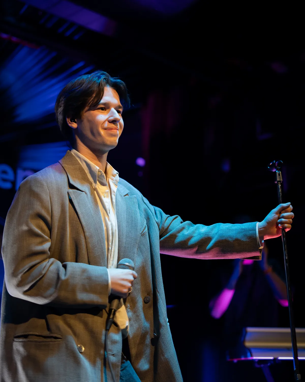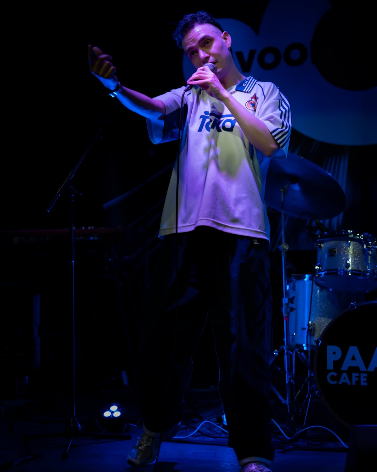 Als eerst betreedt zanger zoef het podium. Zanger Moos de Walle is deze keer zonder band, of zoals hij dat zelf nonchalant oppert: “Dit keyboard is vanavond mijn band.” Dat keyboard stelt gelukkig niet teleur, zowel de muziek als zoef zelf houdt geen moment stil. De Nederlandstalige nummers van zoef zitten vol gevatte en geestige beeltenissen; dat wordt snel duidelijk, als hij in zijn kenmerkende zoef-trainingspak, het tweede nummer ‘chicago galado’ inzet.