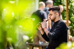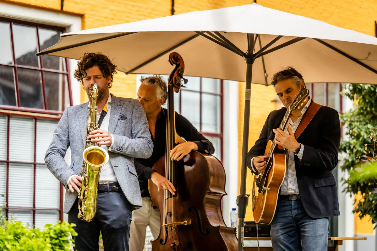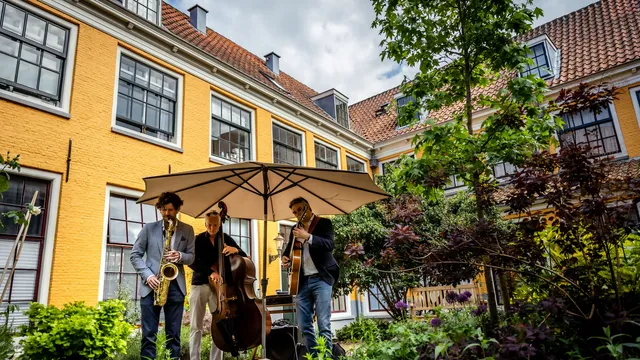 Het is even zoeken naar het eerste échte hofje van de dag, het Maartenshof. Het volgende trio, van tenorsaxofonist Stan van de Wetering, heeft moeten besluiten dat de parasol toch een paraplu is. De miezer mag echter de pret niet drukken: het is tijd voor Jazz met een hoofdletter J. Het trio, een combinatie van tenorsax, semi-akoestische gitaar en contrabas, vangt aan met 'Save your love for me', een voorbode van al het lekkers dat ze ons voor gaan schotelen: jazzklassiekers die geenszins van het uitgemolken soort zijn. Tijdens de eerste gitaarsolo van Vincent Koning gaat spontaan de zon schijnen (tja, de sol in solo), waarop het publiek zich weer verder durft te verspreiden dan alleen onder het afdakje. Kinderen huppelen langs, er klinkt gemompel, er is reuring in het hof, de walking bass van Frans van Geest hinkt een solo in - als je je ogen sluit, ben je gewoon in een smerig goeie jazzkroeg. Een bewoner van het hofje steekt zijn barbecue aan en Van de Wetering gooit nog wat kolen erop, met zijn verhalende kwaliteit à la Stan Getz. Het Stan van de Wetering Trio is de belichaming van wat er zo heerlijk en vreselijk is aan dit festival: je weet dat er zoveel meer te zien is, maar je wilt hier nooit meer weg. Gelukkig is er een toegift.